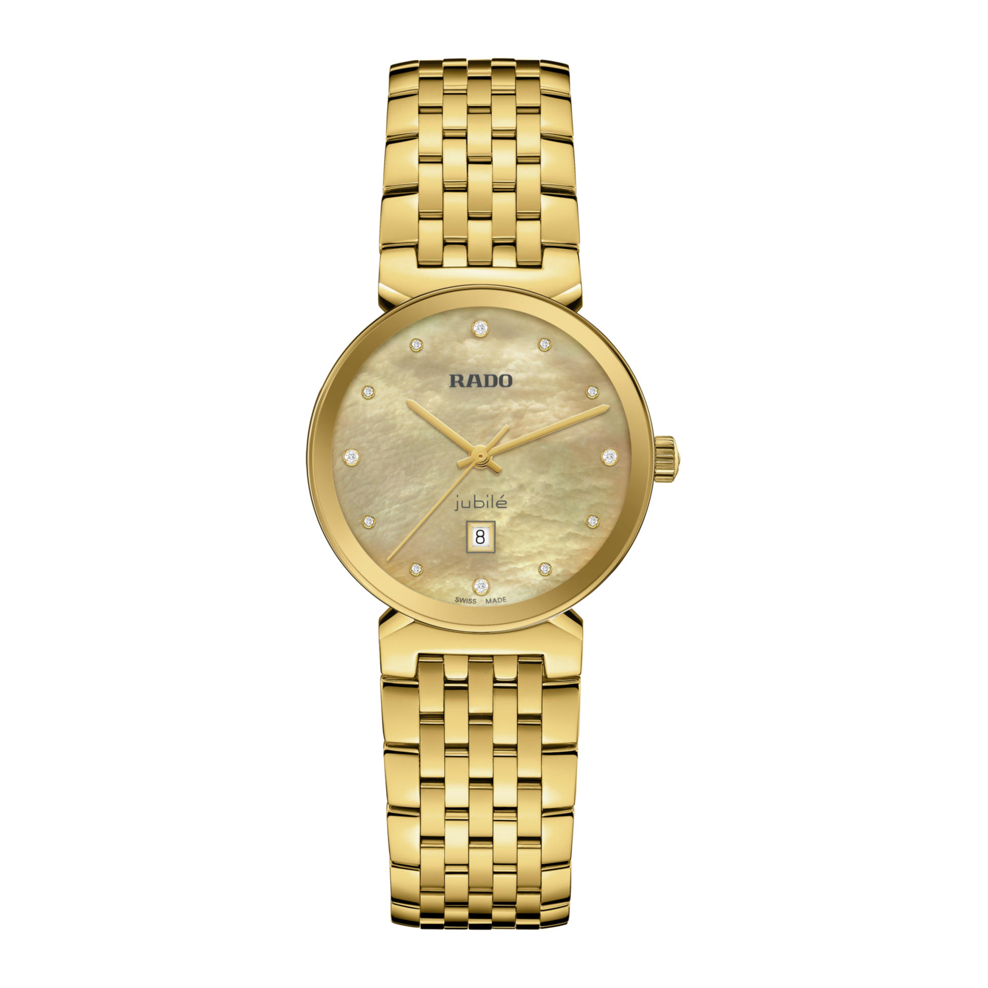 The harmonious design of the Rado Florence calls to mind the elegant domes and towers of the city from which the collection takes its name. Powered by a reliable three-hand Quartz Rado calibre R079 movement, this watch ensures greater accuracy and resistance to shocks. The 30 mm watch has an edge-to-edge-bevelled, curved sapphire crystal. The watch boasts a polished yellow gold coloured PVD coated stainless steel case, crown, bezel and case back. The bracelet made of polished yellow gold coated stainless steel completes the overall appearance of this classic timepiece. The mother-of-pearl dial with 12 diamonds, emphasised with the printed “jubilé” logo, matches perfectly with the yellow gold coloured hands. The watch is water resistant down to 50 m and is also available in L size, which makes it an ideal couples’ watch.
