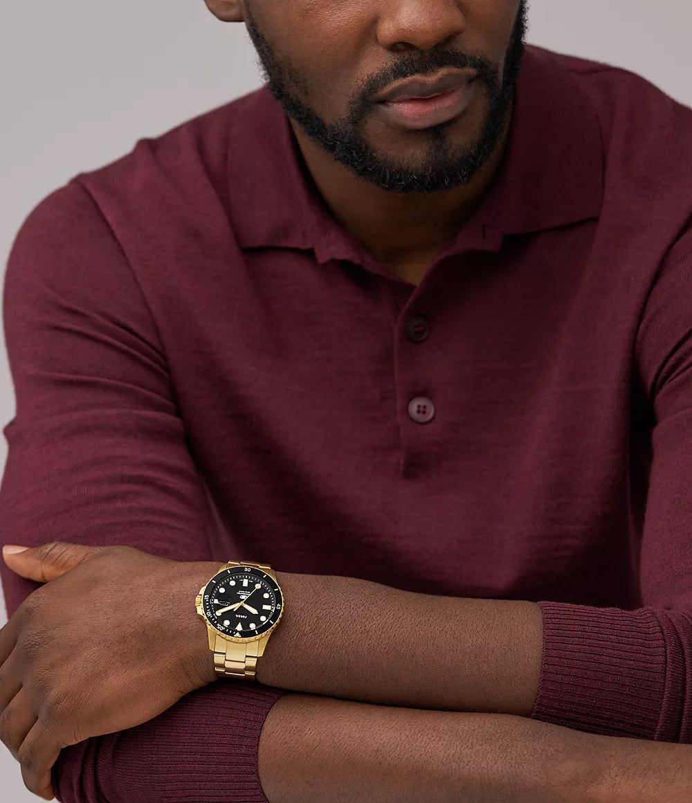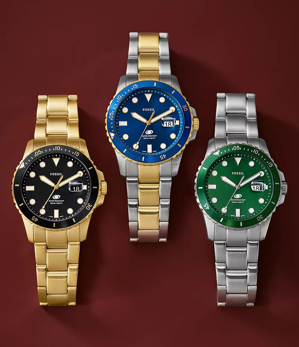 Purposeful design details define our time-honoured watch collection, Fossil Blue Dive. This gold-tone dive-style timepiece is expertly crafted with a 3-link stainless steel bracelet, geometric indices and a unidirectional rotating topring. Tested to 100 meters of water resistance. *Not ISO certified.