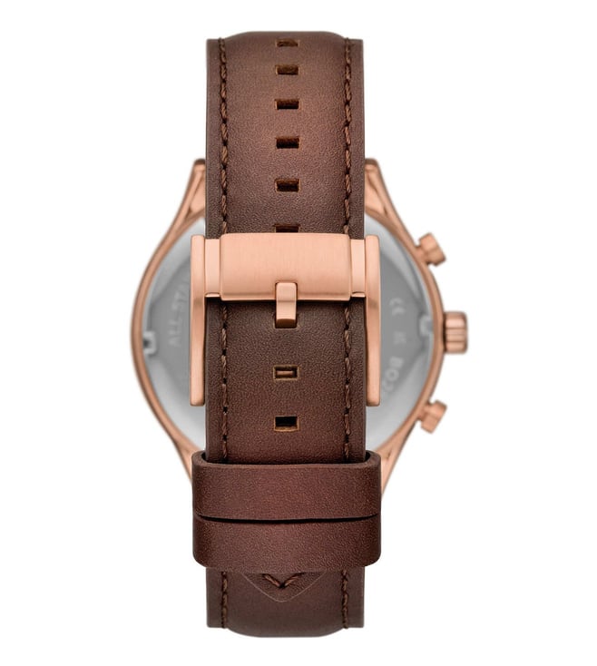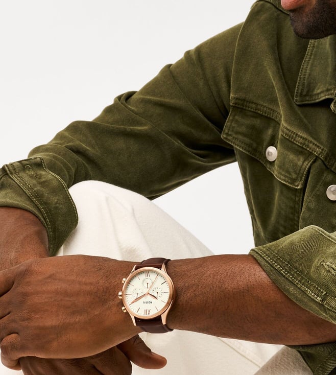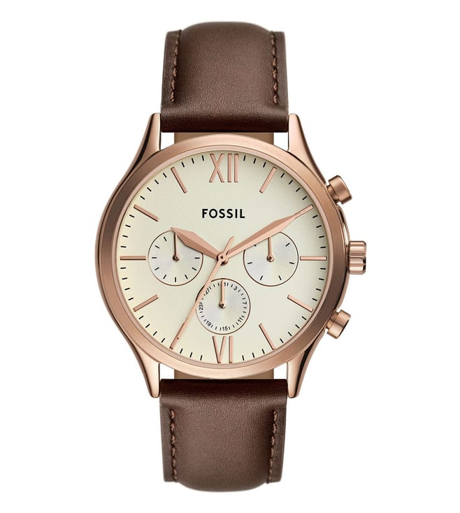This 44mm Fenmore features a cream satin dial, multifunction movement and brown leather strap. Fossil leather products support responsible manufacturing via the Leather Working Group.