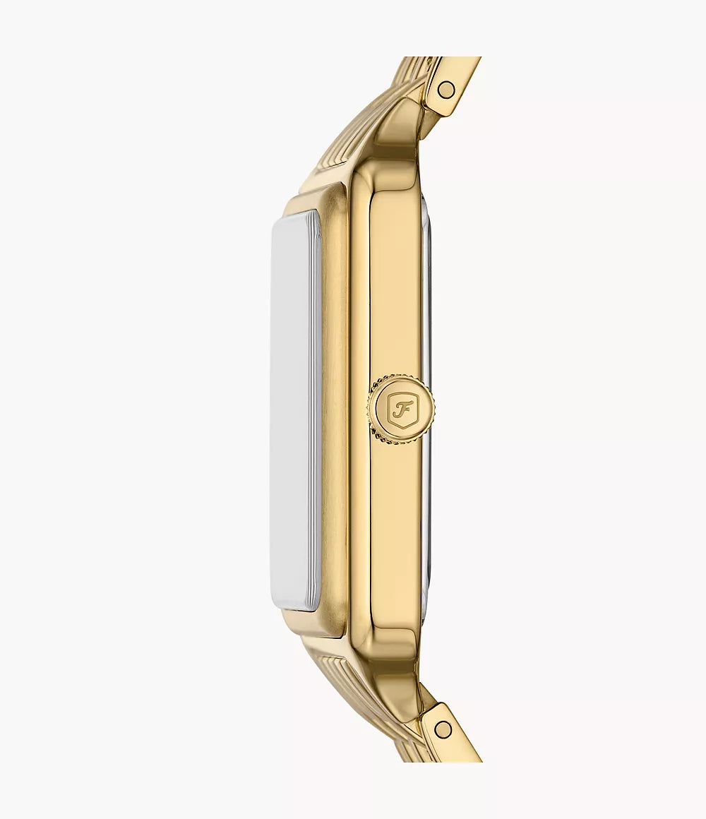 Reinventing a true vintage-inspired icon, the Raquel watch balances timeless style with modern flair. An elegant rectangular case framed in gleaming gold-tone stainless steel houses a lustrous abalone shell dial with an applied Butterfly motif. Paired with a matching gold-tone bracelet, this polished timepiece lends sophistication to every look.