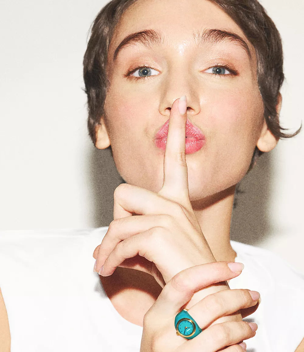 Sleek, stylish, and made for the modern woman on the go, our Watch Ring collection fuses fashion forward design with everyday functionality. This two hand timepiece features a dainty round gold tone stainless steel case paired with vivid blue glossy enamel. Water resistant to 50 meters, it¿s the ideal blend of style and durability for summer adventures.