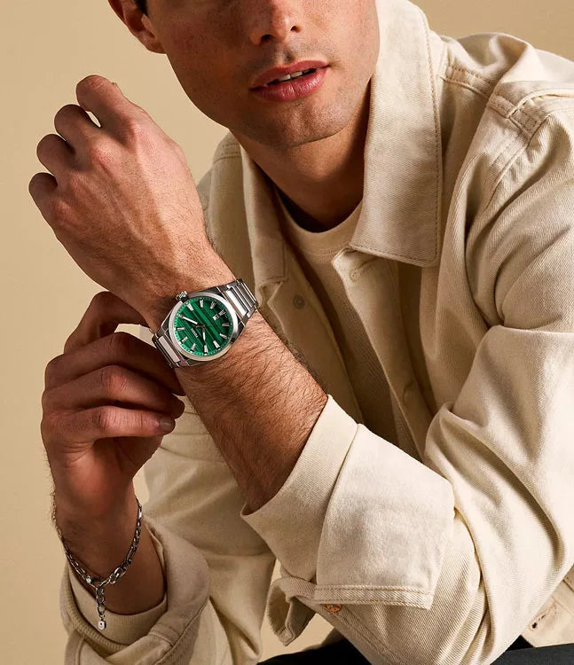 This sporty Everett watch favors the bold with a stainless steel H-link bracelet and genuine malachite stone dial featuring eye-catching indices.