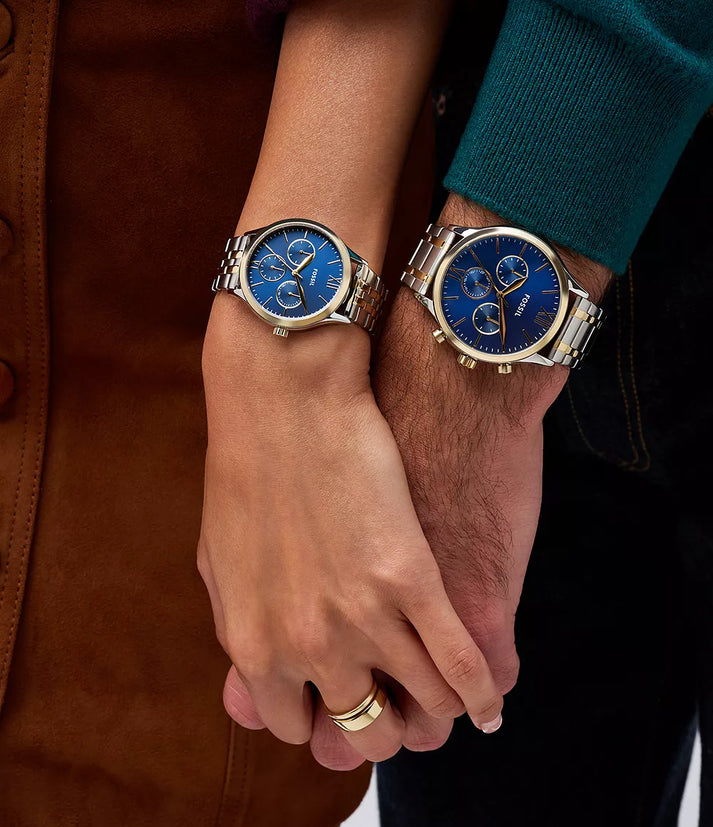 This gift set features 44mm and 36mm Fenmore watches, with matching blue sunray dials, multifunction movement and two-tone stainless steel bracelets.
