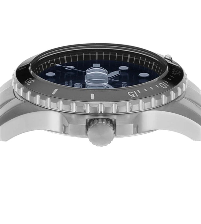 Purposeful design details define our time- Honored watch collection, Fossil Blue Dive. This stainless steel dive-style timepiece is expertly crafted with a 3-link stainless steel bracelet, geometric indices and a unidirectional rotating top ring. Tested to 100 meters of water resistance. *Not ISO certified.