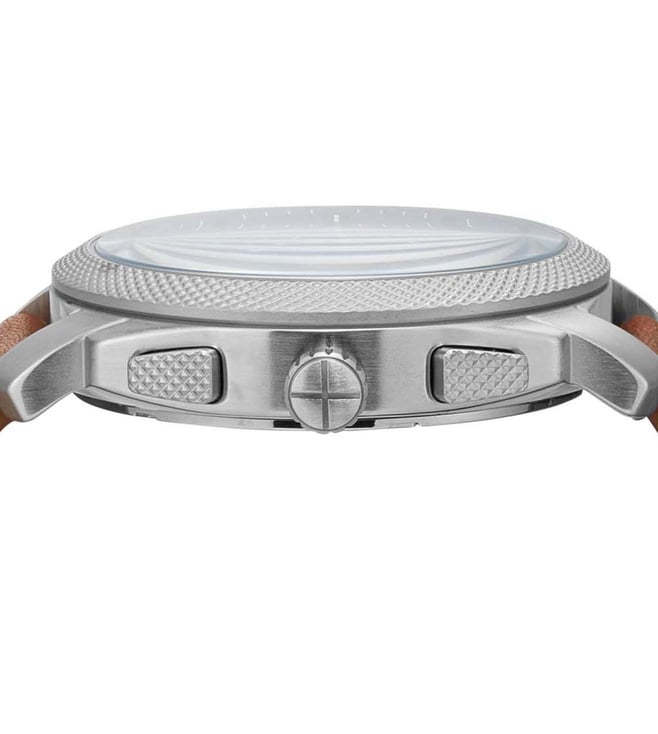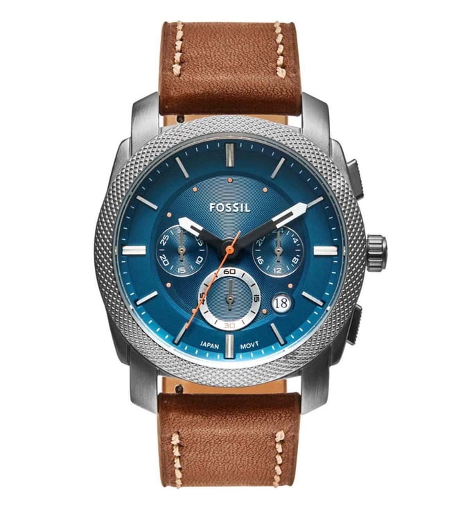 This 42mm Machine features a blue satin textured dial, chronograph movement and brown leather strap. Fossil leather products support responsible manufacturing via the Leather Working Group.