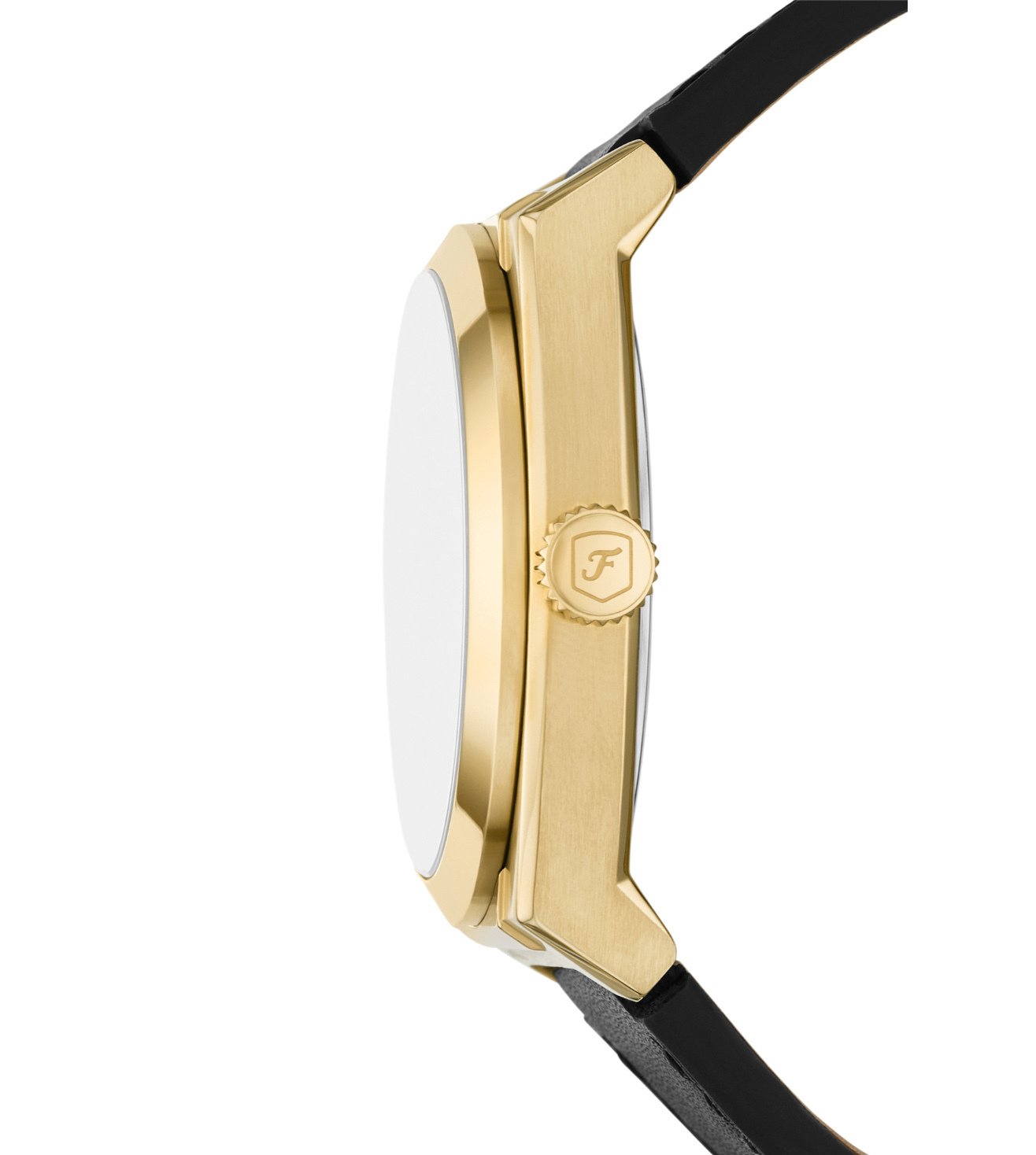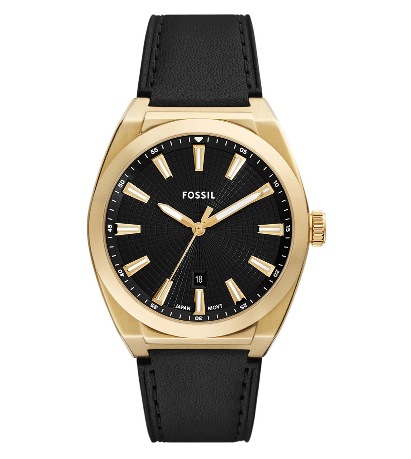 This 42mm Everett features a black sunray dial, three-hand date movement and black leather strap. Fossil leather products support responsible manufacturing via the Leather Working Group.