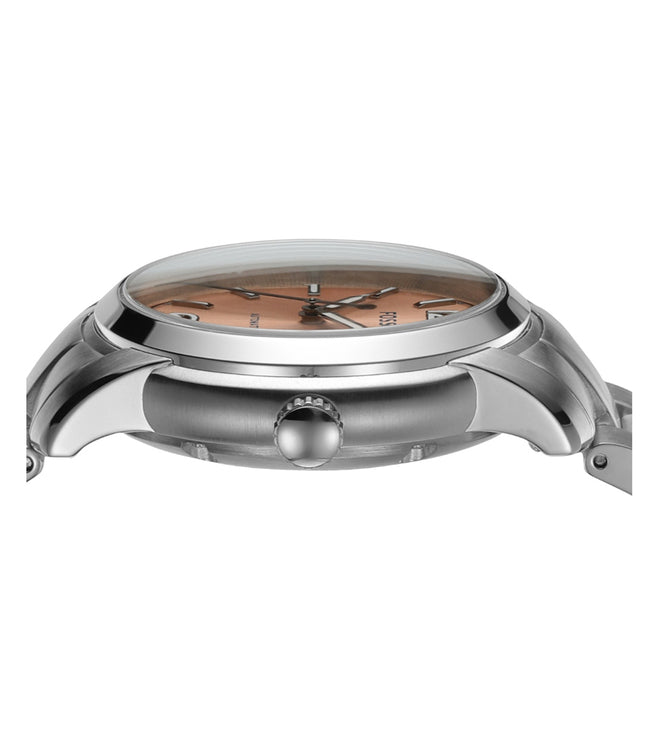 Amaze everyone around you by wearing this women's analog watch from FOSSIL. The rose gold round dial is protected by a mineral glass. The stainless steel strap comes in a silver hue that further elevates the look of the timekeeper. Besides, it is completed with a fold-over push button clasp with safety clasp to ensure a secure fit on the wrist.
