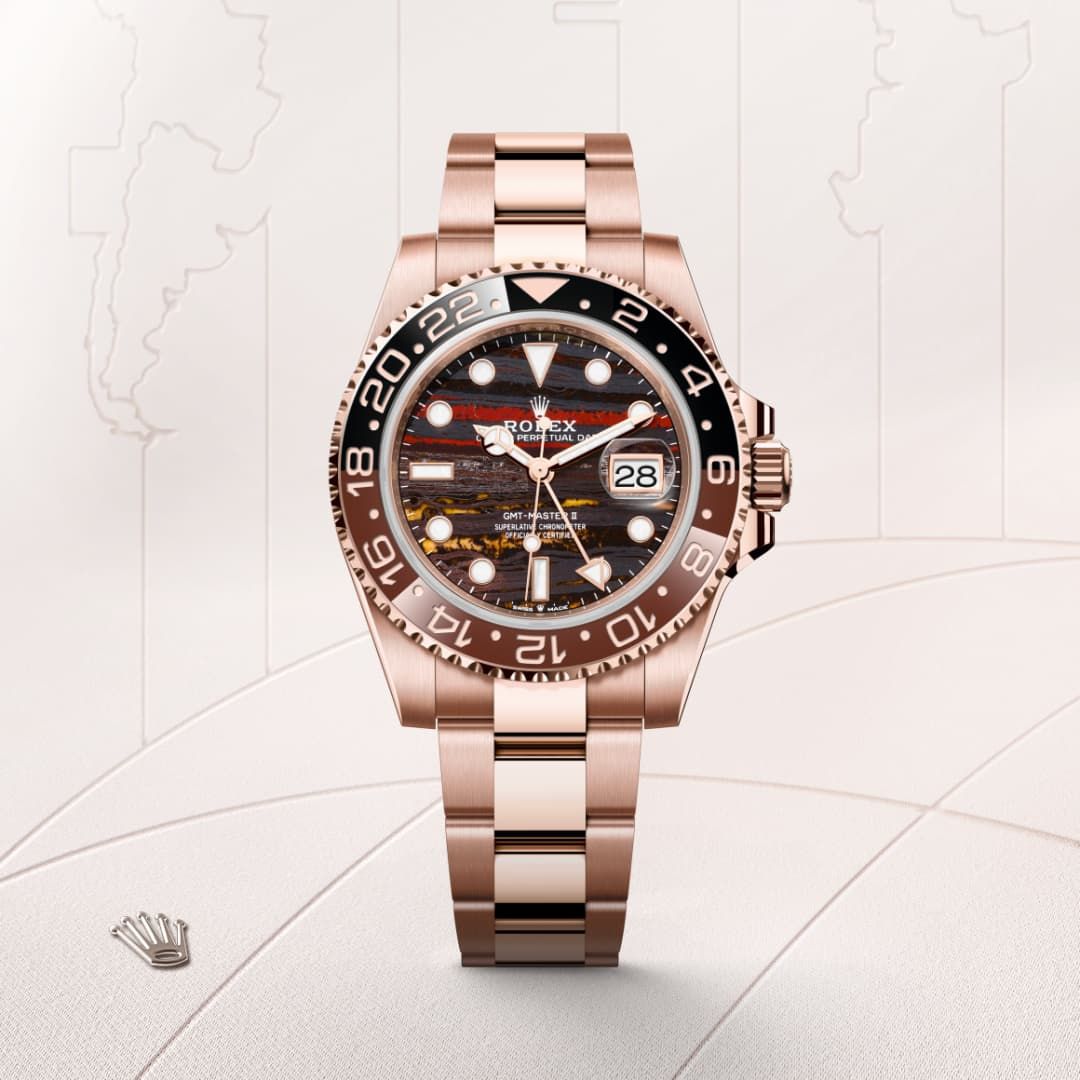 This GMT-Master II features a dial in tiger iron. This metamorphic rock, used by Rolex for the first time on this watch, is characterized by its complex structure. Composed of three minerals – tiger’s eye, red jasper and silvery hematite – it is a stone that pulses with golden and orangey tints, which, following painstaking selection and meticulous assembly, marry harmoniously with the colours of the case and bracelet.