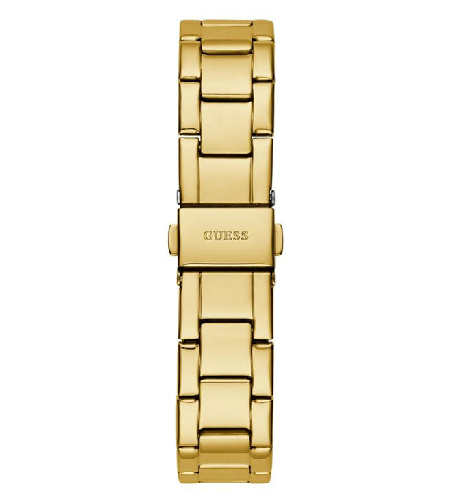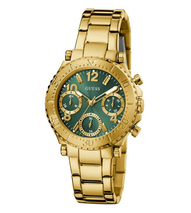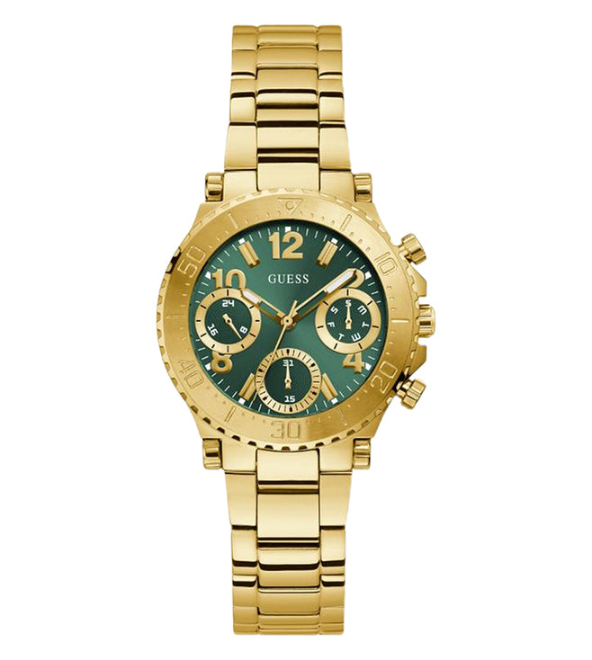 Look modish by donning this women's analog watch from the Cosmic collection by GUESS. Enclosed in a 30.8 mm case, the green round dial looks quite attractive. It displays plain three hands and a crown for time adjustment. The stainless steel bracelet showcases a golden hue that uplifts the look of the timepiece. Moreover, it is fitted with a push-button clasp to ensure a secure fit on the wrist.