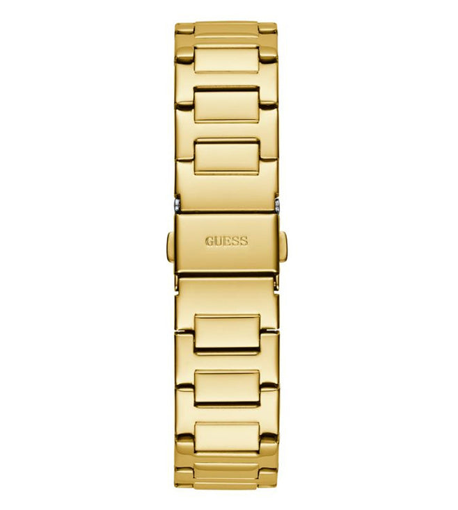 Infuse class to your attire with this women's analog watch from the Duchess collection by GUESS. The golden square dial is nestled in a 40 mm case. It exhibits plain three hands and a crown for time adjustment. The stainless steel bracelet exudes a golden hue that accentuates the look of the watch. Moreover, it is fitted with a push-button clasp to ensure a secure fit on the wrist.