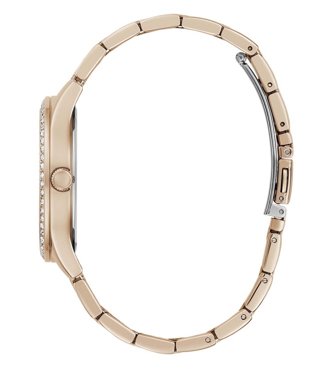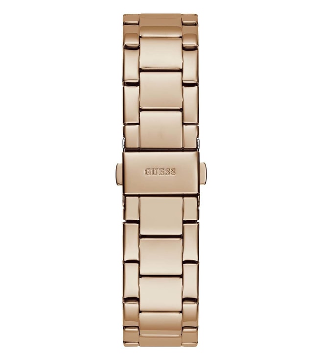Carry great technology wrapped around your wrist with this watch from Guess. Housed in a 38 mm case, the dial is shielded with mineral glass and runs on a quartz movement. It is water resistant up to 30 m and is finished with a push button clasp to guarantee a snug fit on the wrist. It is a stylish and elegant timepiece. The dial adds a touch of sophistication, making it suitable for various occasions. This watch is an excellent choice for those who appreciate a fashionable and chic accessory that complements their personal style with a touch of glamour.