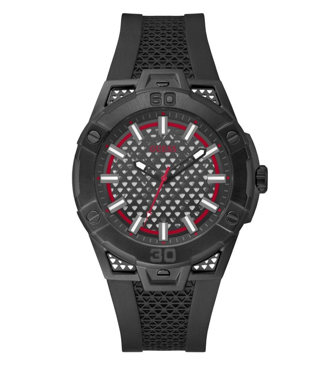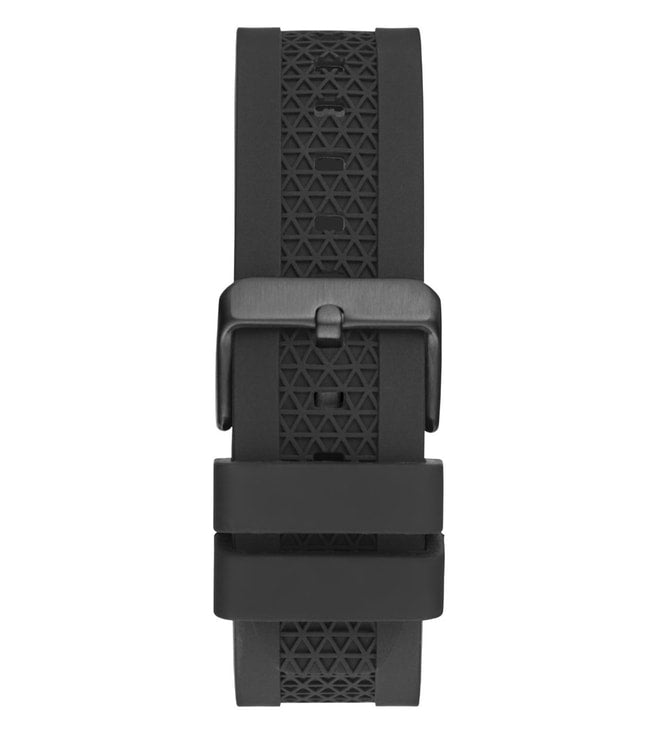 Add a stylish dimension to your look by wearing this men's analog watch from the collection by GUESS. Theblack round dial is protected by a mineral glass. It features and a crown for time adjustment. The stainless steel strap comes in a black hue that further elevates the look of the timekeeper. Besides, it is completed with a strap buckle clasp to ensure a secure fit on the wrist.