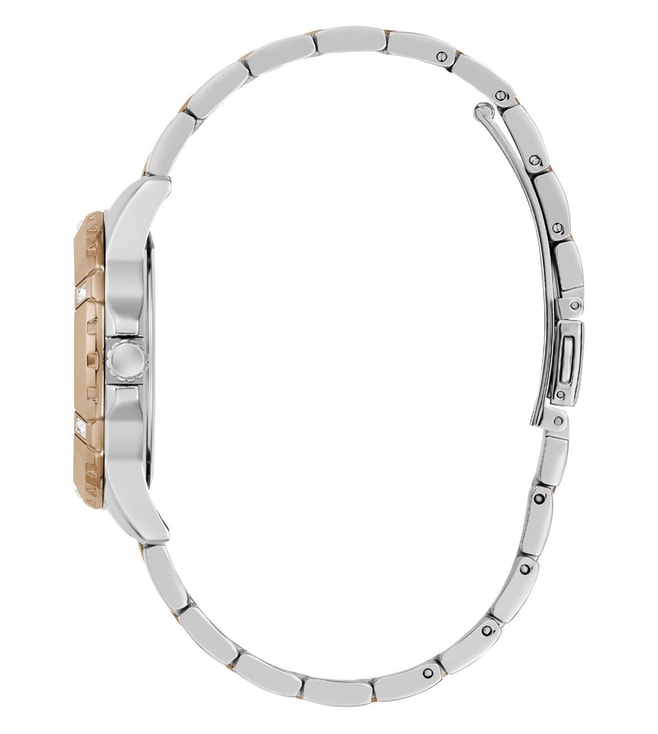 Look modish by donning thiswomen's analog watch from the collection by GUESS. Thered round dial is protected by a mineral glass. It features and a crown for time adjustment. The stainless steel strap comes in a two tone hue that further elevates the look of the timekeeper. Besides, it is completed with a pilot buckle clasp to ensure a secure fit on the wrist.
