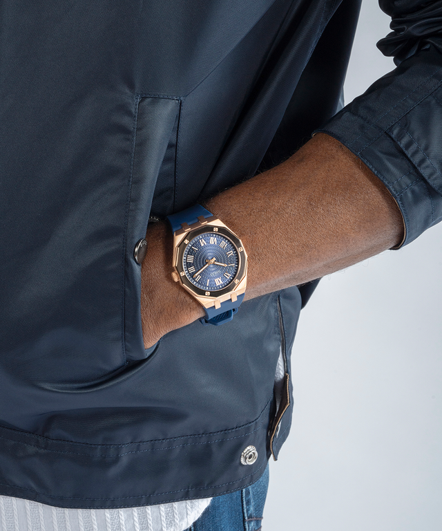 An asset to any man's wardrobe, this stunning octagonal case design with screw details features an upscale dial design with roman numerals and a sleek silicone strap