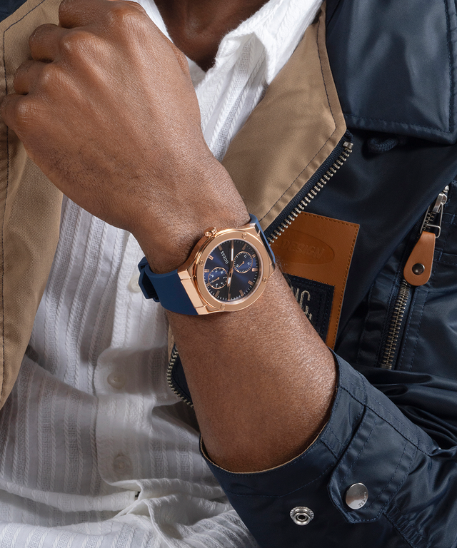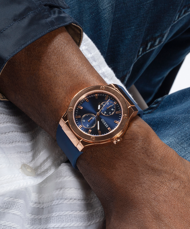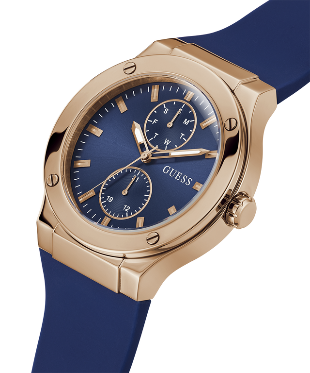 GUESS Mens Blue Rose Gold Tone Multi-function Watch