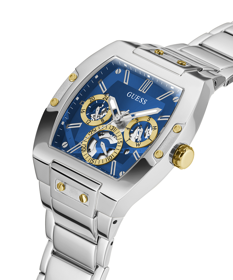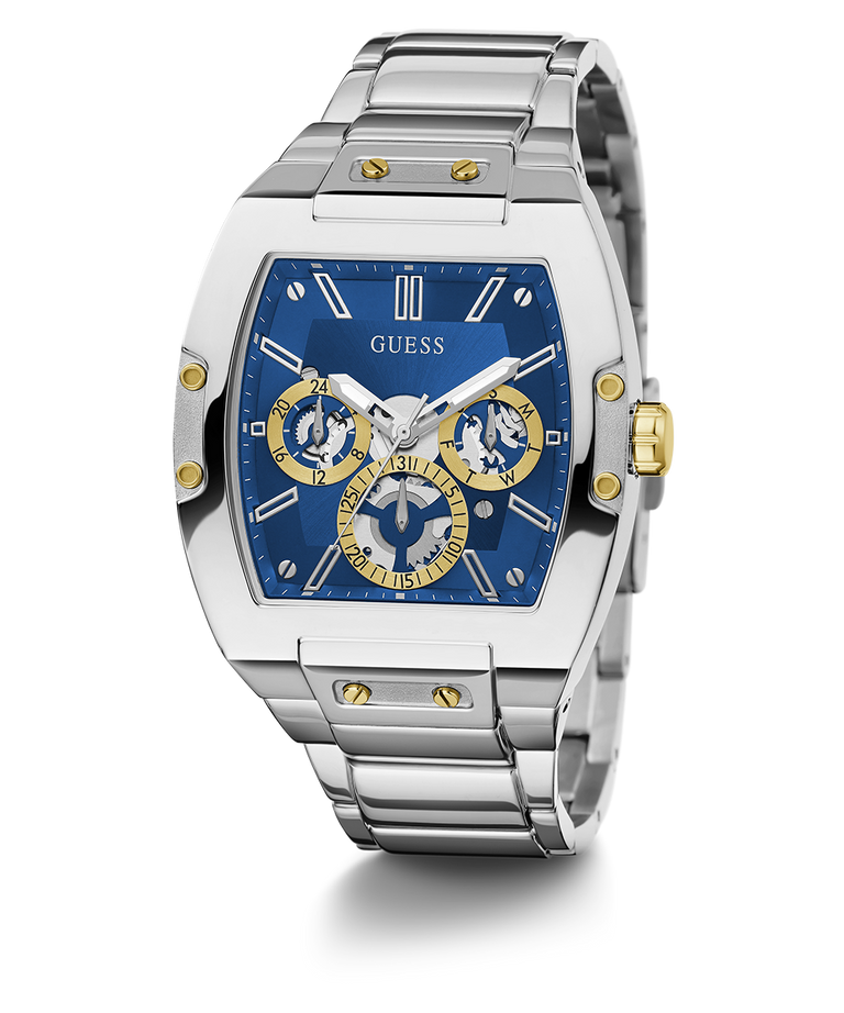 Skeleton dial details keep this phoenix on the rise. Featuring a silver-tone barrel shaped case with a blue and gold multi-function dial.