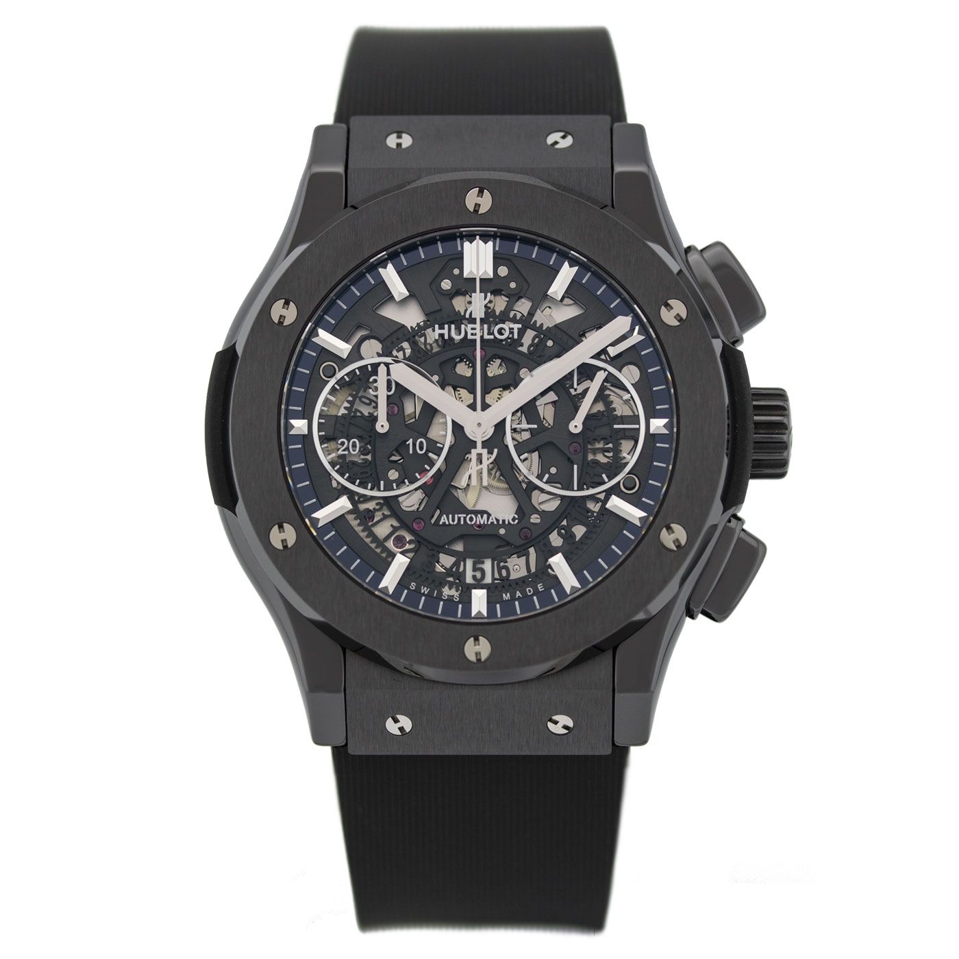Black ceramic case with a black rubber strap. Fixed black ceramic bezel. Black composite resin bezel lug sandwiched between the bezel and case. Skeleton dial with silver-tone hands and index hour markers. Minute markers around the outer rim. Dial Type: Analog. Luminescent hands and markers. Date display at the 6 o'clock position. Chronograph - two sub-dials displaying: 60 second and 30 minute. Automatic movement with a 42-hour power reserve. Scratch resistant sapphire crystal. Pull / push crown. Transparent case back. Case diameter: 45 mm. Round case shape. Strap width: 20.3 mm. Push button fold over clasp. Water resistant at 50 meters / 165 feet. Functions: chronograph, date, hour, minute, second. Luxury watch style. Watch label: Swiss Made. Hublot Classic Fusion Aerofusion Chronograph Automatic Black Magic Skeleton Dial Men's Watch 525.CM.0170.RX