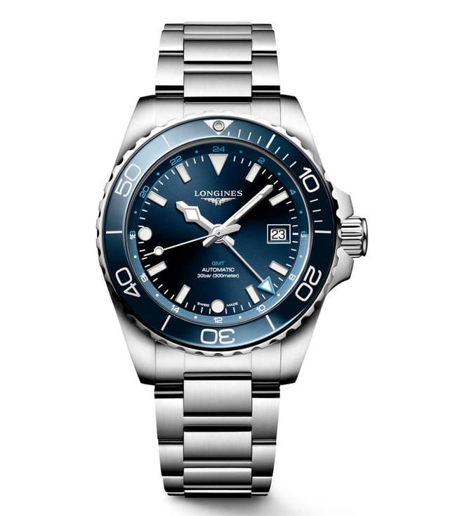 The HydroConquest GMT is also distinguished by its 41 mm-diameter stainless steel case with screw-down back and crown. This model features a new unidirectional notched bezel in blue ceramic with luminescent capsule. The dial is blue. This version comes with a stainless-steel bracelet, or a blue rubber strap.
