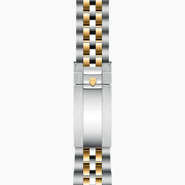 Screw-down winding crown with the TUDOR rose in relief. Steel covered by a 0.1mm yellow gold cap