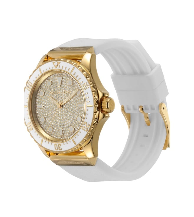 Enhance your style quotient by wearing this women's analog watch from Michael Kors. The gold round dial is protected by a mineral glass. Michael Kors' 43mm Everest watch features a gold pave dial, three-hand movement and white silicone strap. Besides, it is completed with a buckle clasp to ensure a secure fit on the wrist.