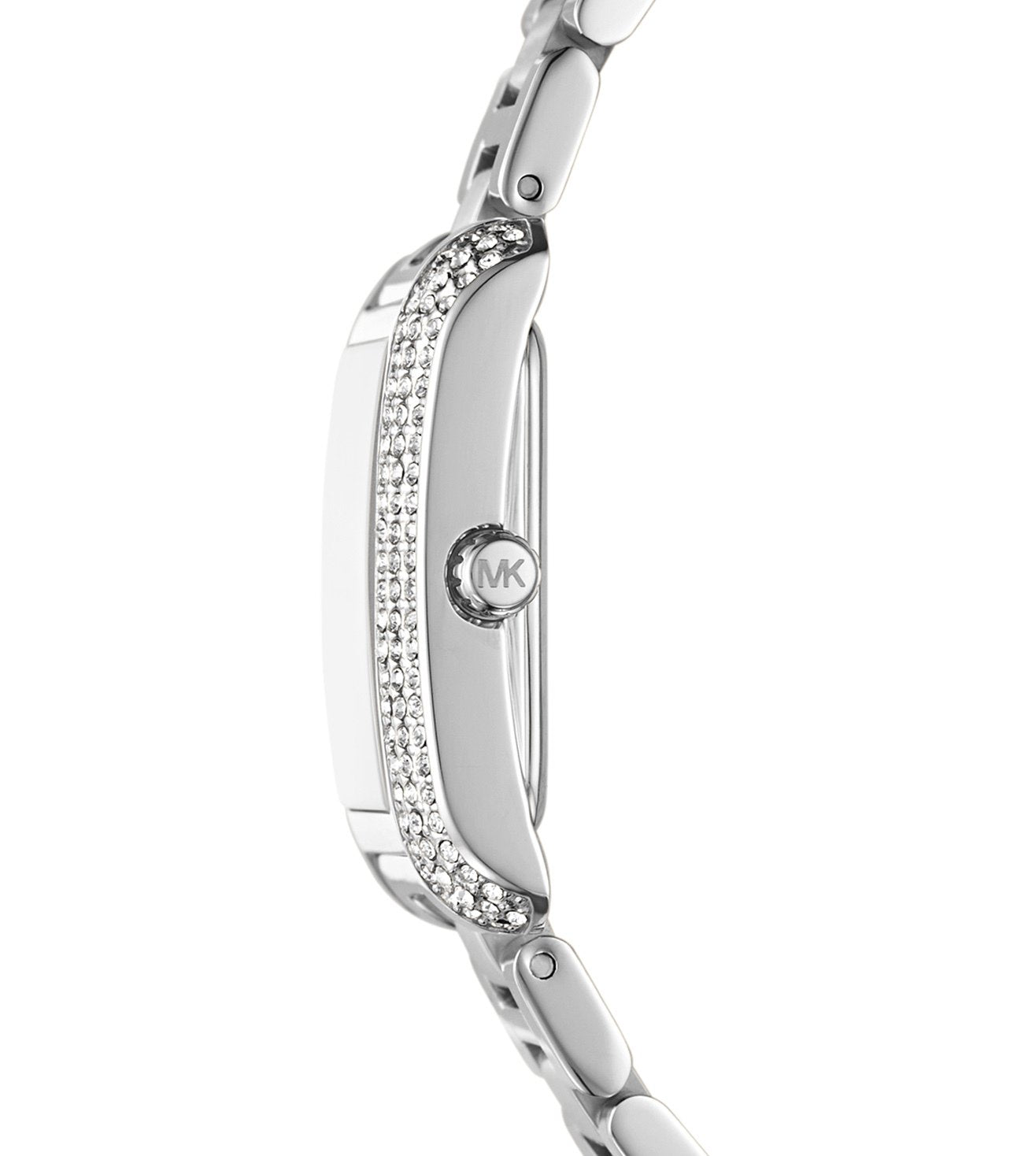 Michael Kors' gift set includes silver-tone brass hoop earrings, a silver-tone brass paperclip bracelet and a 27mm Emery watch featuring a white sunray dial, three-hand movement and stainless steel bracelet. Amaze everyone around you by wearing this women's analog watch from the collection by Michael Kors. The white rectangular dial is protected by a mineral glass. It features a crown for time adjustment.