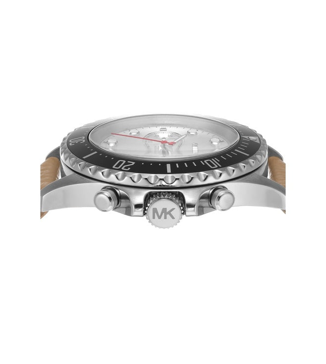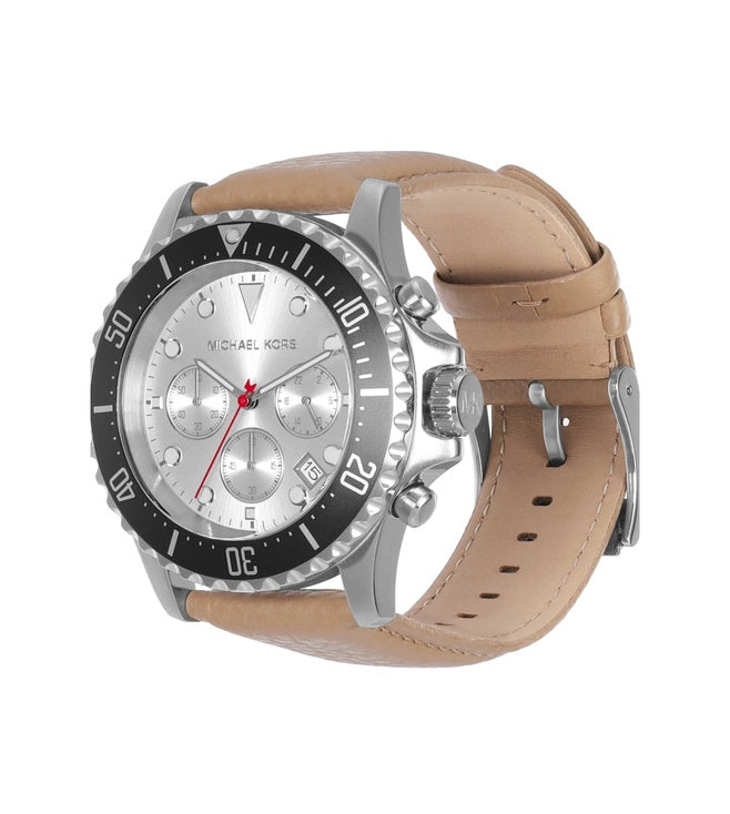 Add smartness to your personality by wearing this men's analog watch from Michael Kors. The white round dial is protected by a mineral glass. Michael Kors' 45mm Everest watch features a white sunray textured dial, chronograph movement and camel leather strap. Besides, it is completed with a buckle clasp to ensure a secure fit on the wrist.