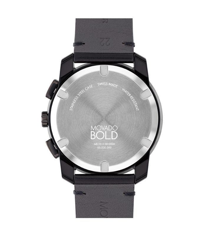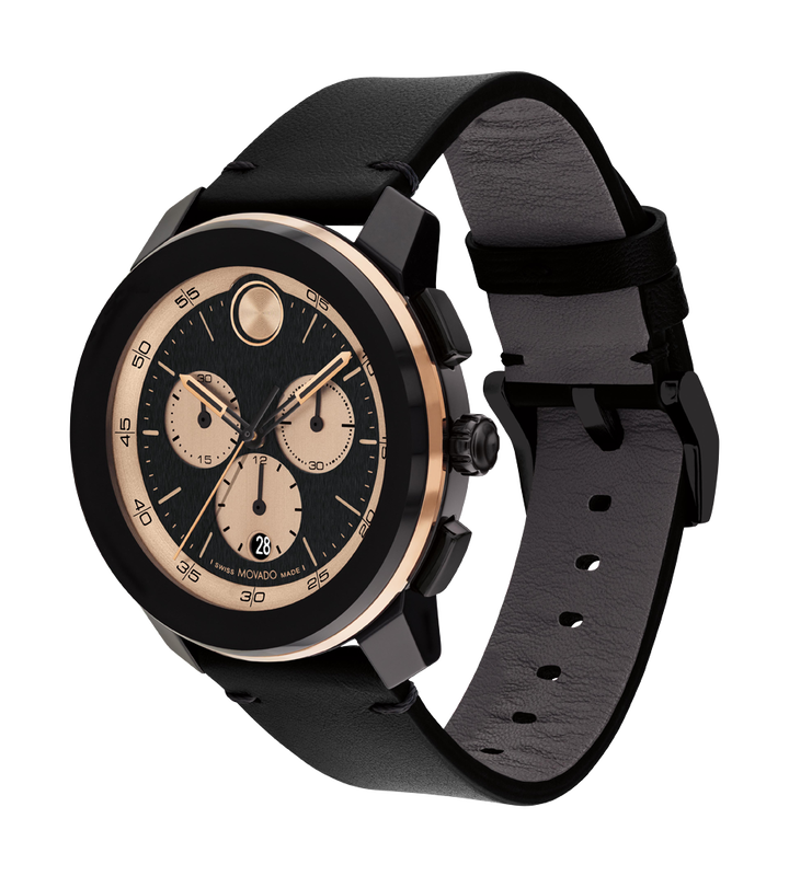 Ultra-modern design with a sporty edge. Crafted from innovative TR90 in cool black, this contemporary timepiece boasts a statement-making 43.5mm case. Its black and bronze-colored chronograph dial features three subdials, black Swiss Super-LumiNova accents, and a date window. A luxe black leather strap completes the design