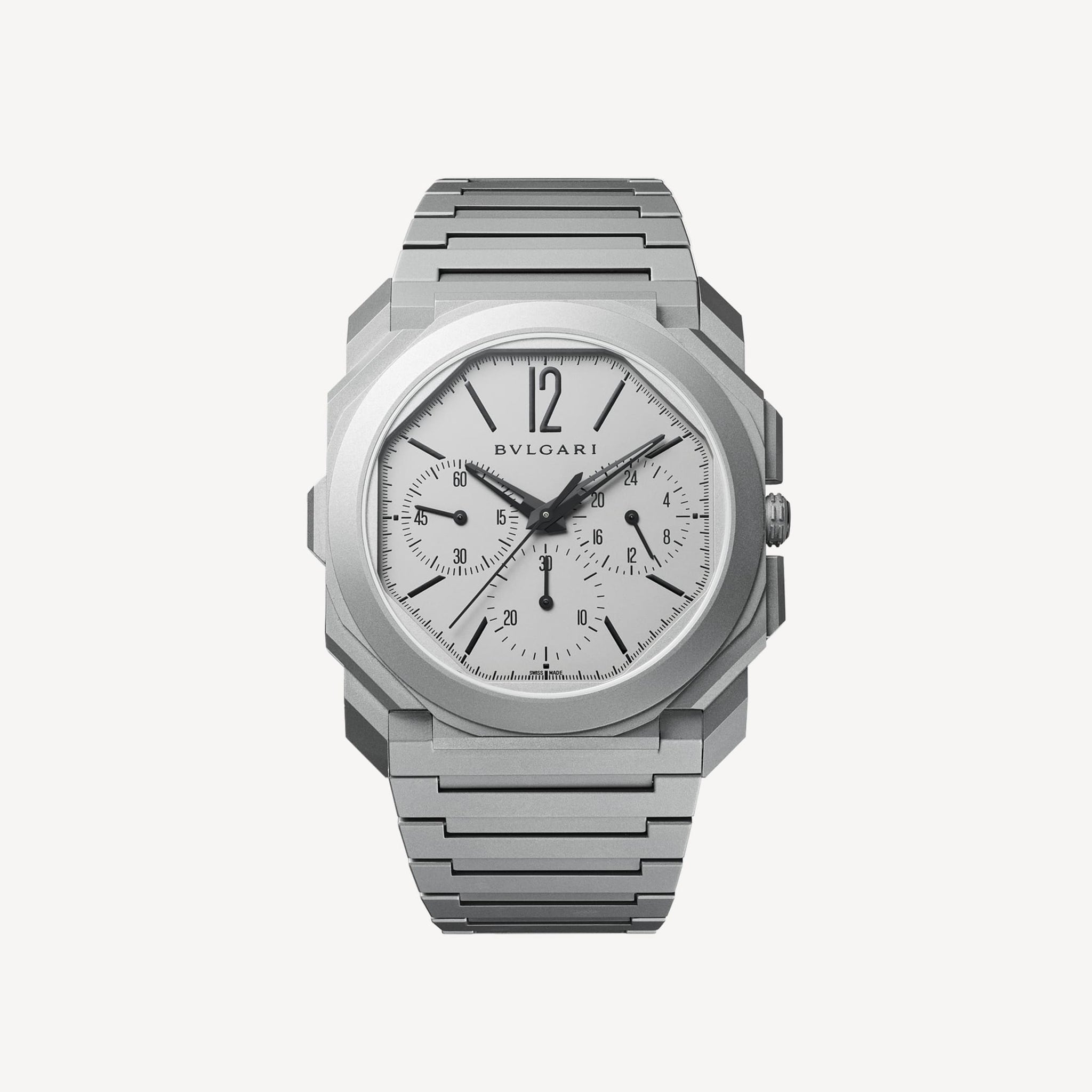 A perfect blend of technical sophistication and aesthetic refinement, the Octo Finissimo Chronograph GMT is the world’s slimmest self-winding watch endowed with a chronograph and GMT function, earning a leading position among the ultra-competitive luxury sport watch universe.With its timeless monochromatic look, the exciting timepiece combines the well-known chronograph, as the favourite tool of a generation living on the fast track, and a GMT function, showing two time zones at once, creatively reinventing a classic complication the Italian way. Octo Finissimo Chrono GMT watch with extra-thin mechanical manufacture chronograph and GMT movement, automatic winding with peripheral rotor, BVL 318 caliber (3.30 mm thick), 55 hours power reserve. 42 mm extra-thin titanium case (6.90 mm thick), transparent case back, titanium crown set with ceramic element, sandblasted titanium dial, sandblasted titanium bracelet and folding clasp. Water-resistant up to 30 metres.