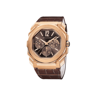 Octo Finissimo Chronograph GMT watch with mechanical manufacture ultra-thin movement (3.30 mm thick), automatic winding, hours, minutes, small seconds, second time zone, chrono functions, BVL318 calibre, 28,800 vph (4 Hz) frequency, 37 jewels and 55-hour power reserve. 43 mm satin-polished 18 kt rose gold case (8.75 mm thick), 18 kt rose gold crown with black ceramic insert, brown lacquered dial with sunray finish, 18 kt rose gold indexes with SLN, transparent caseback, brown alligator bracelet and ardillon buckle. Water-resistant up to 100 metres