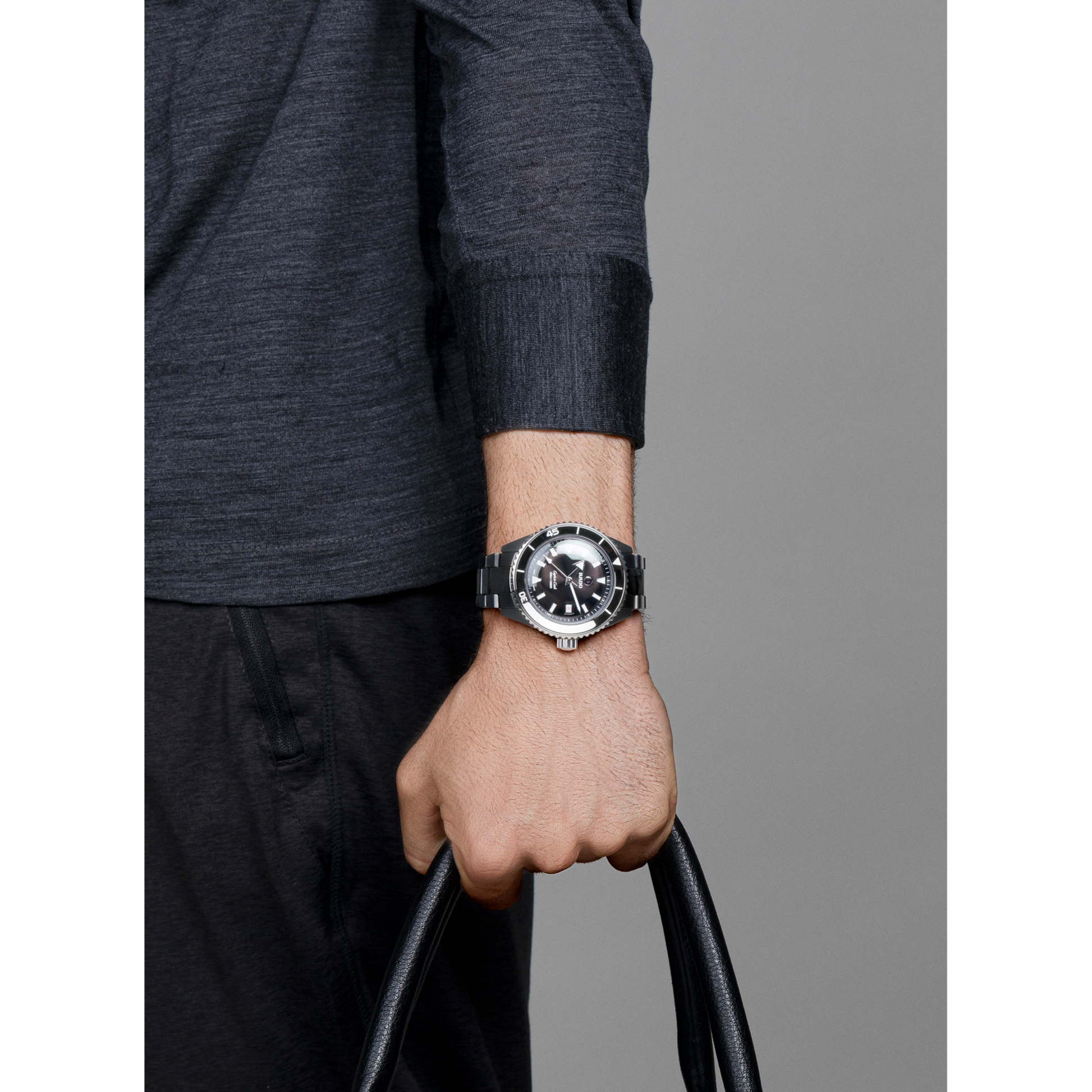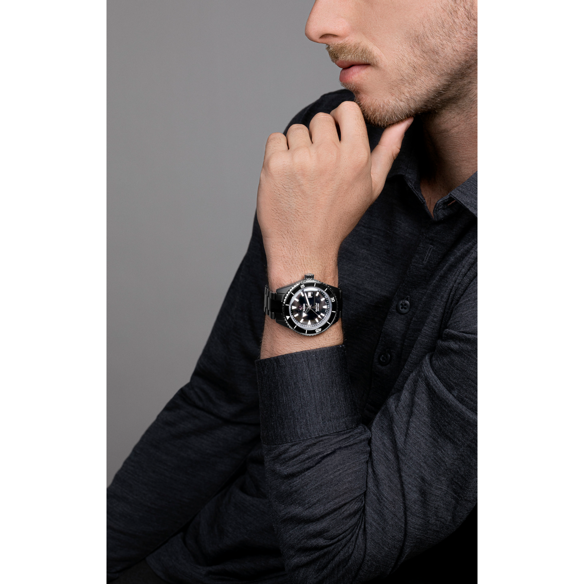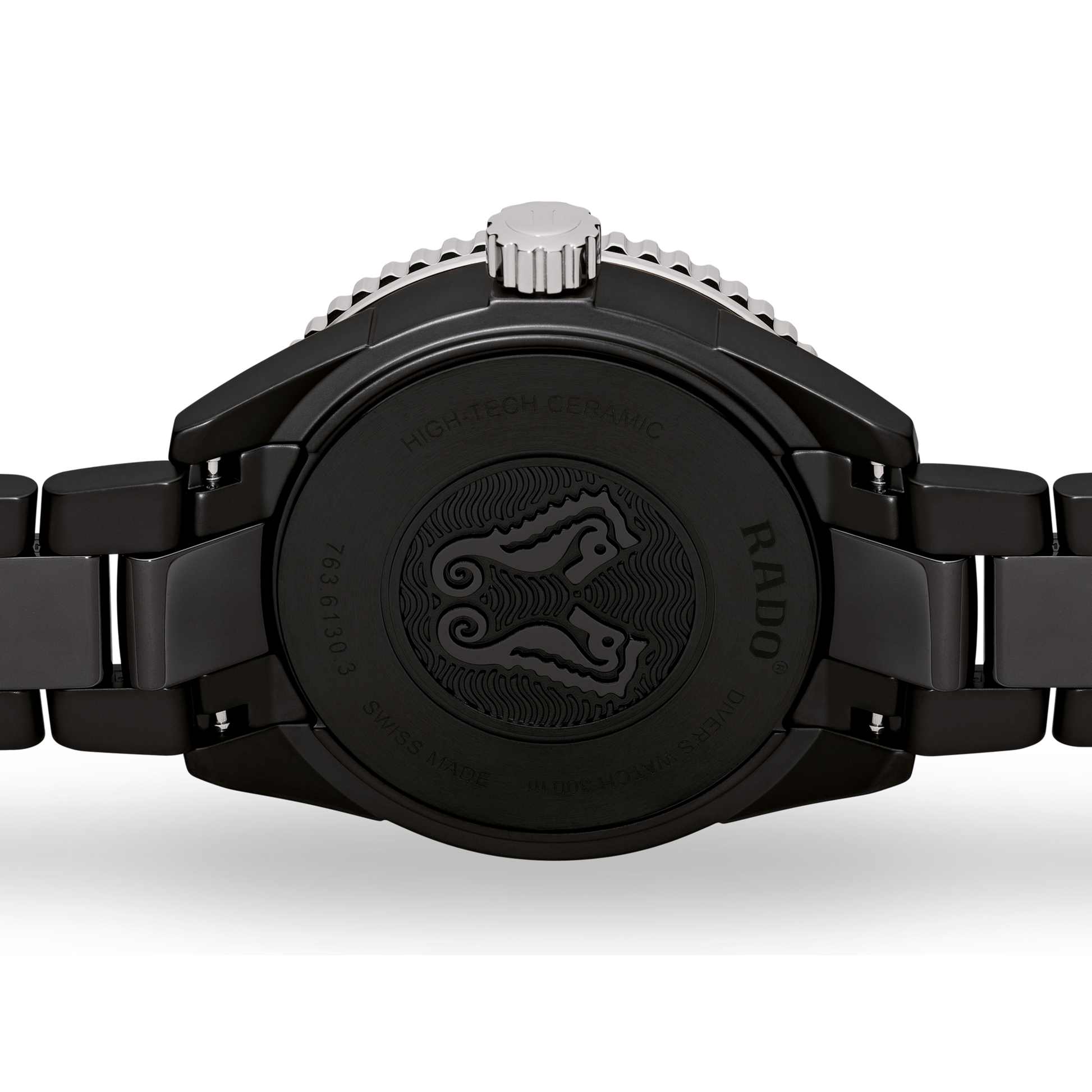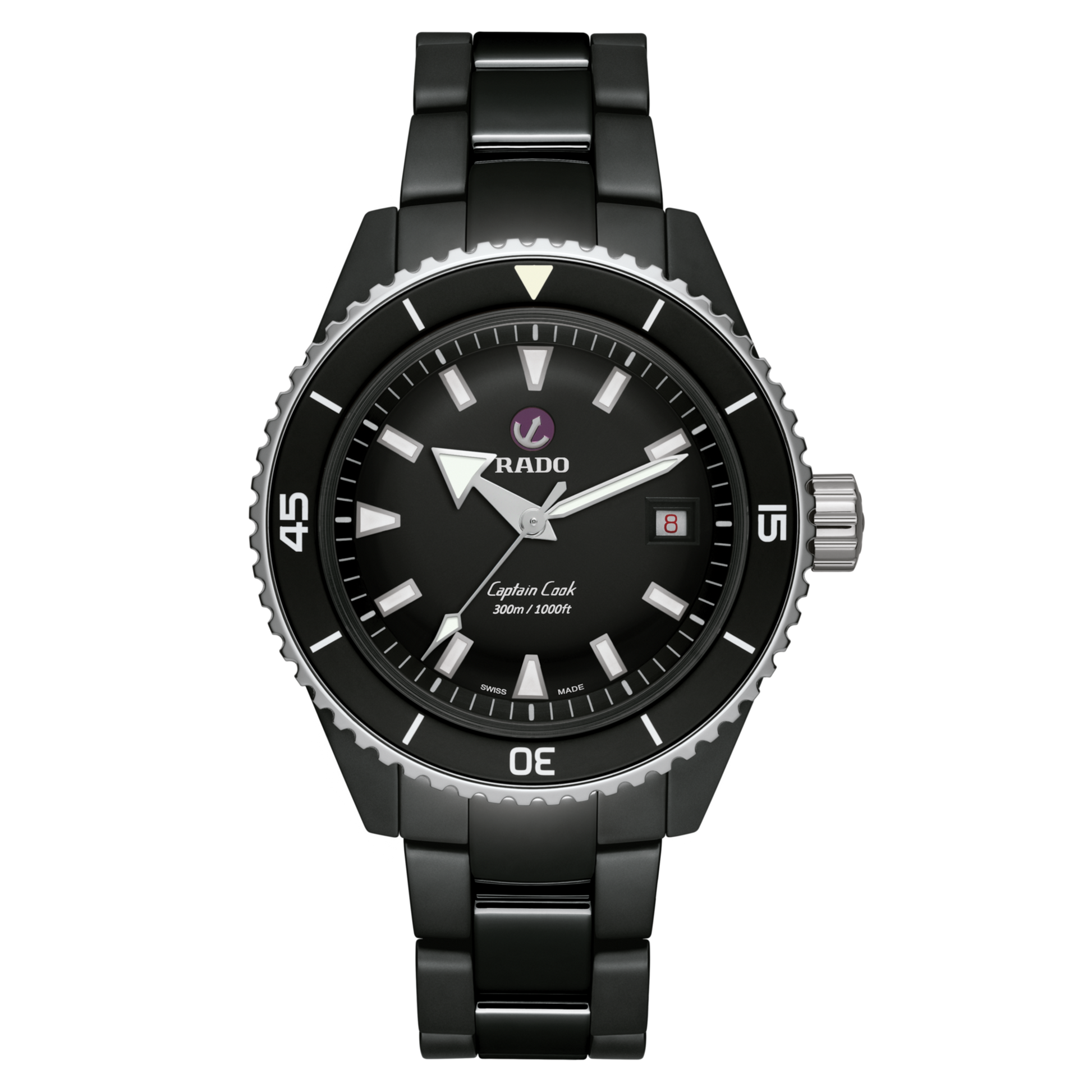 The Captain Cook High-Tech Ceramic Diver watch is water resistant down to 300 m. The hands and indices of the ISO 6425 certified diver's watch are coated with SuperLuminova® to ensure excellent visibility on the black lacquered and polished dial. The 43 mm monobloc case is made of matt black high-tech ceramic, while the rotating bezel is made of hardened, polished stainless steel. Inside, the Rado R763 automatic movement exceeds standard accuracy test requirements by a full five points and offers 80 hours of power reserve. This model comes with a polished, black, high-tech ceramic bracelet. Whatever your field of exploration is, your Captain Cook High-Tech Ceramic Diver will be a reliable and solid partner at your side for years to come.