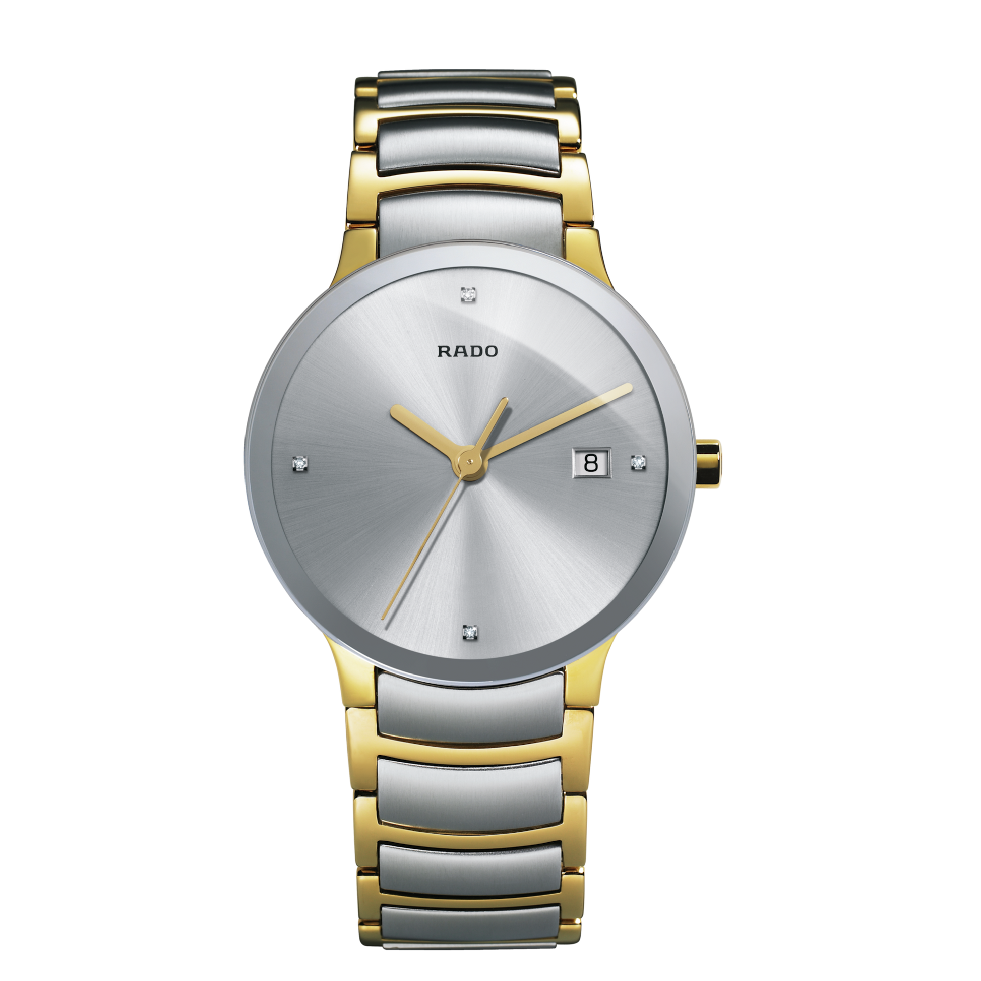 18kt gold PVD stainless steel case with a two-tone (silver-tone and 18kt gold PVD) stainless steel bracelet. Fixed silver-tone stainless steel bezel. Silver dial with gold-tone hands. Diamond markers at the 3, 6, 9 and 12 o'clock positions. Dial Type: Analog. Date display at the 3 o'clock position. Quartz movement. Scratch resistant sapphire crystal. Pull / push crown. Solid case back. Case size: 38 mm. Case thickness: 7.5 mm. Round case shape. Band width: 22 mm. Band length: 7 inches. Deployment clasp. Water resistant at 30 meters / 100 feet. Functions: date, hour, minute, second. Dress watch style. Rado Centrix Jubile Silver Dial Two-tone Mens Watch R30931713.