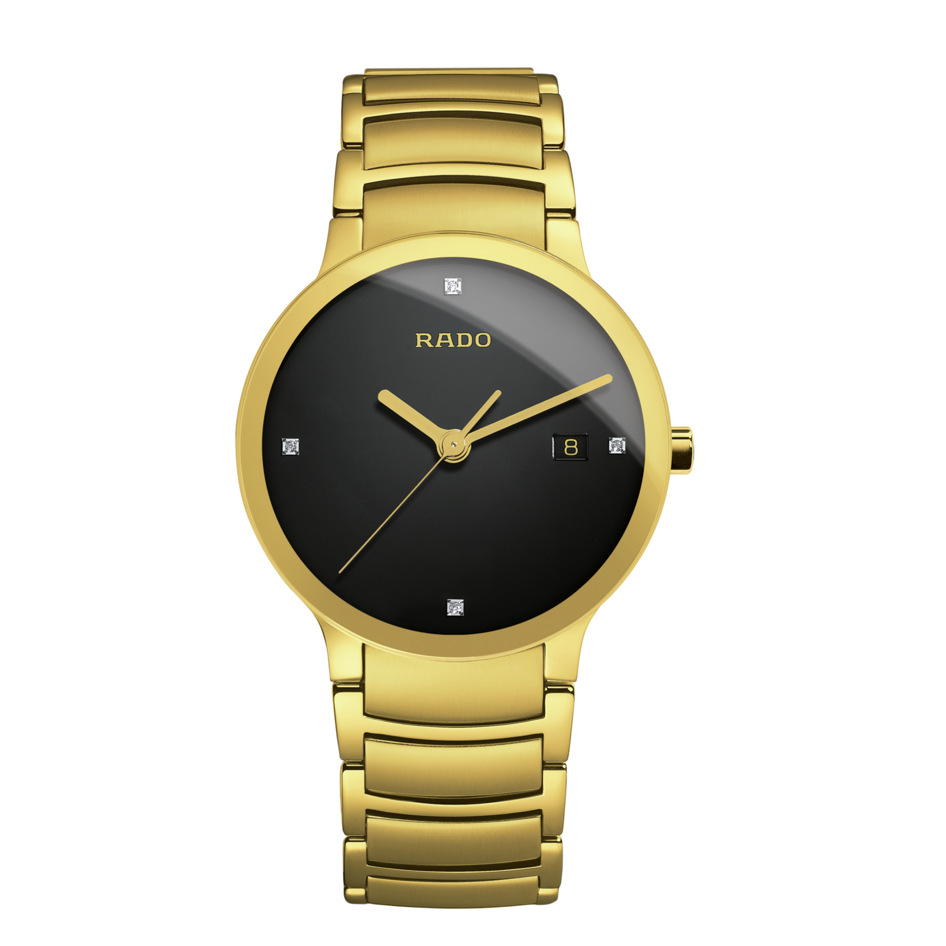 Yellow gold-plated stainless steel case with a yellow gold-plated stainless steel bracelet. Fixed gold-plated stainless steel bezel. Black dial with gold-tone hands. Diamonds mark the 3, 6, 9 and 12 o'clock positions. Dial Type: Analog. Date display at the 3 o'clock position. Quartz movement. Scratch resistant sapphire crystal. Pull / push crown. Solid case back. Case diameter: 38 mm. Round case shape. Band width: 20 mm. Deployment with push button clasp. Water resistant at 30 meters / 100 feet. Functions: date, hour, minute, second. Dress watch style. Rado Centrix Jubile Black Diamond Dial Gold-Plated Stainless Steel Mens Watch R30527713.