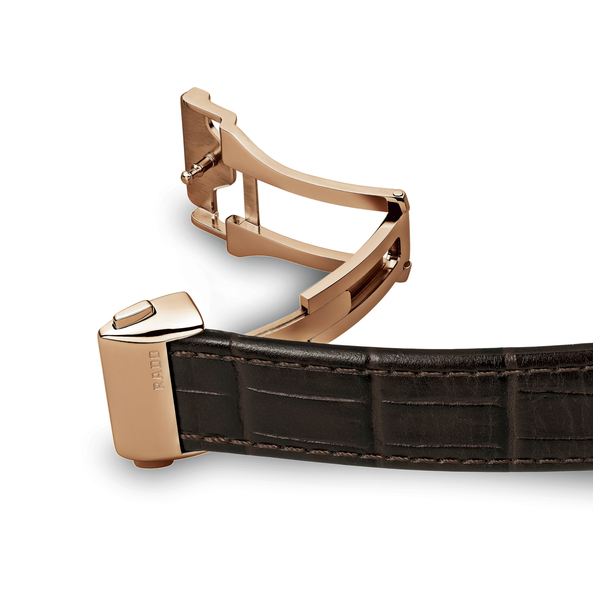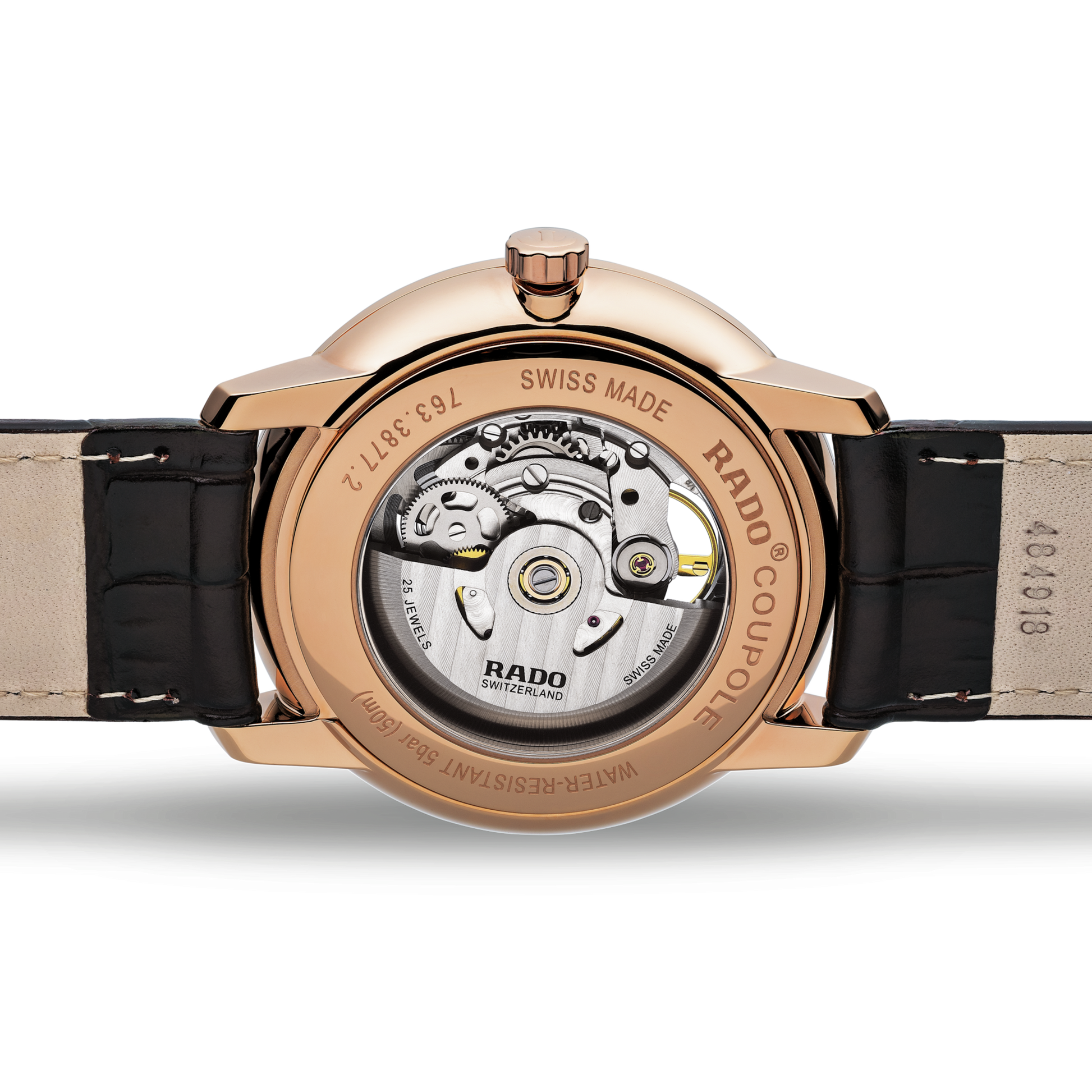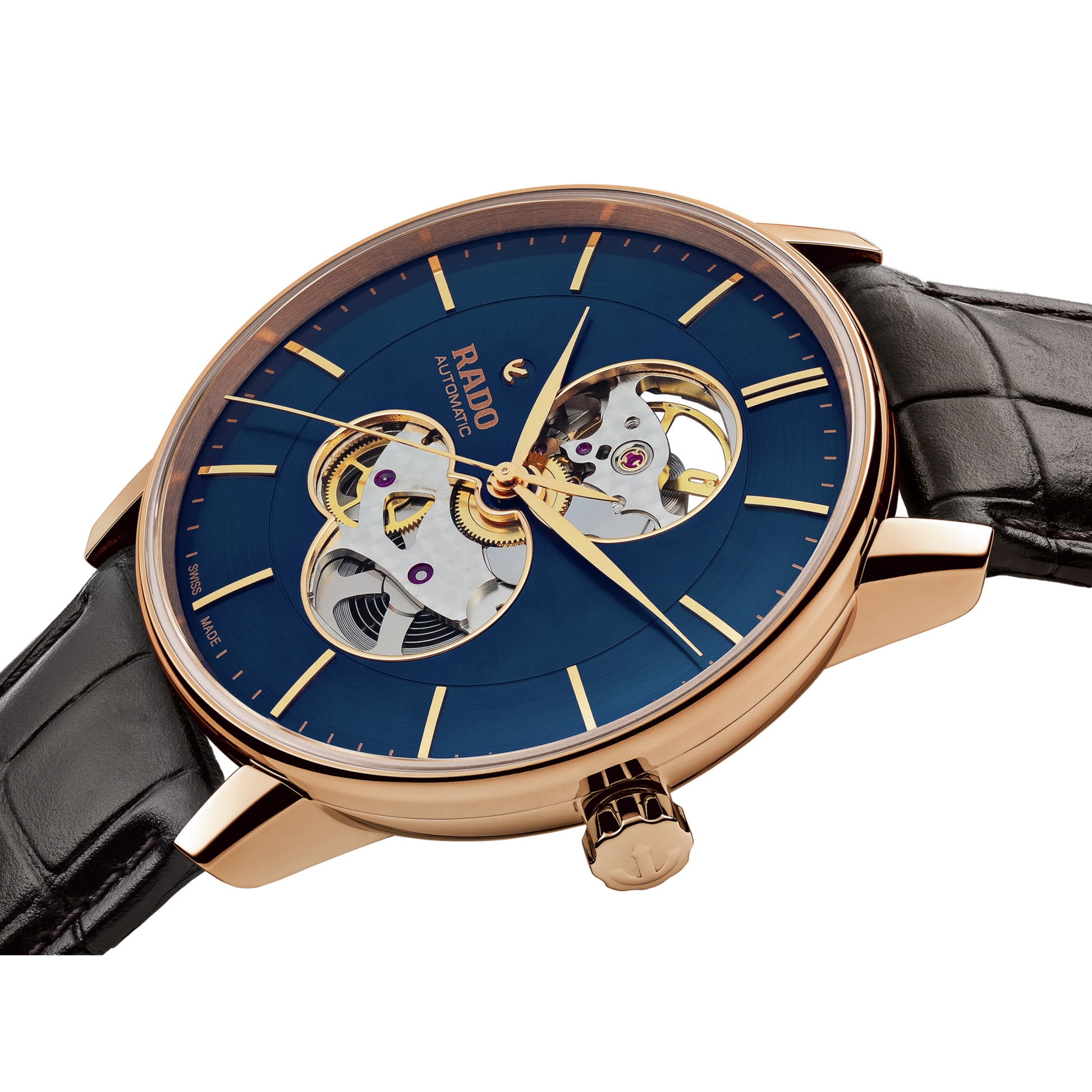 Rose gold-tone stainless steel case with a brown leather strap. Fixed rose gold-tone stainless steel bezel. Blue dial with rose gold-tone hands and index hour markers. Minute markers around the outer rim. Dial Type: Analog. Automatic movement with an 80-hour power reserve. Scratch resistant sapphire crystal. Pull / push crown. Transparent case back. Round case shape, case size: 41 mm, case thickness: 11.7 mm. Water resistant at 50 meters / 165 feet. Functions: hour, minute, second. Casual watch style. Watch label: Swiss Made. Rado Coupole Classic Open Heart Automatic Blue Dial Mens Leather Watch R22895215.