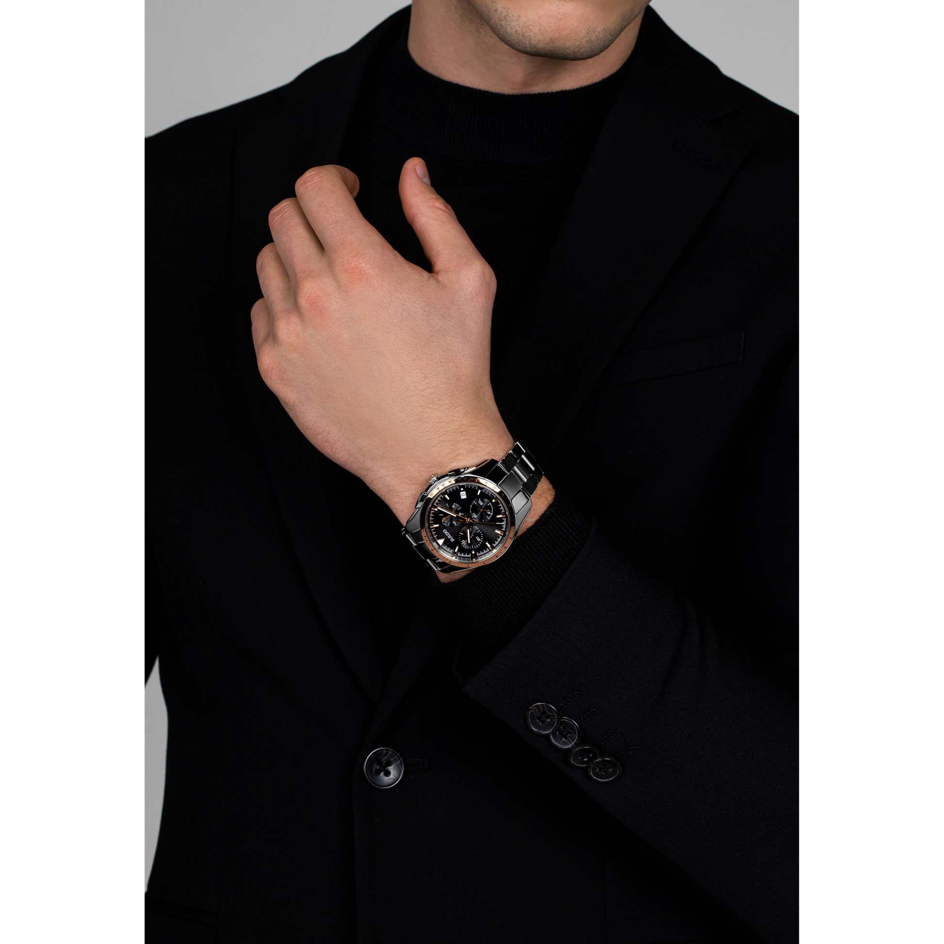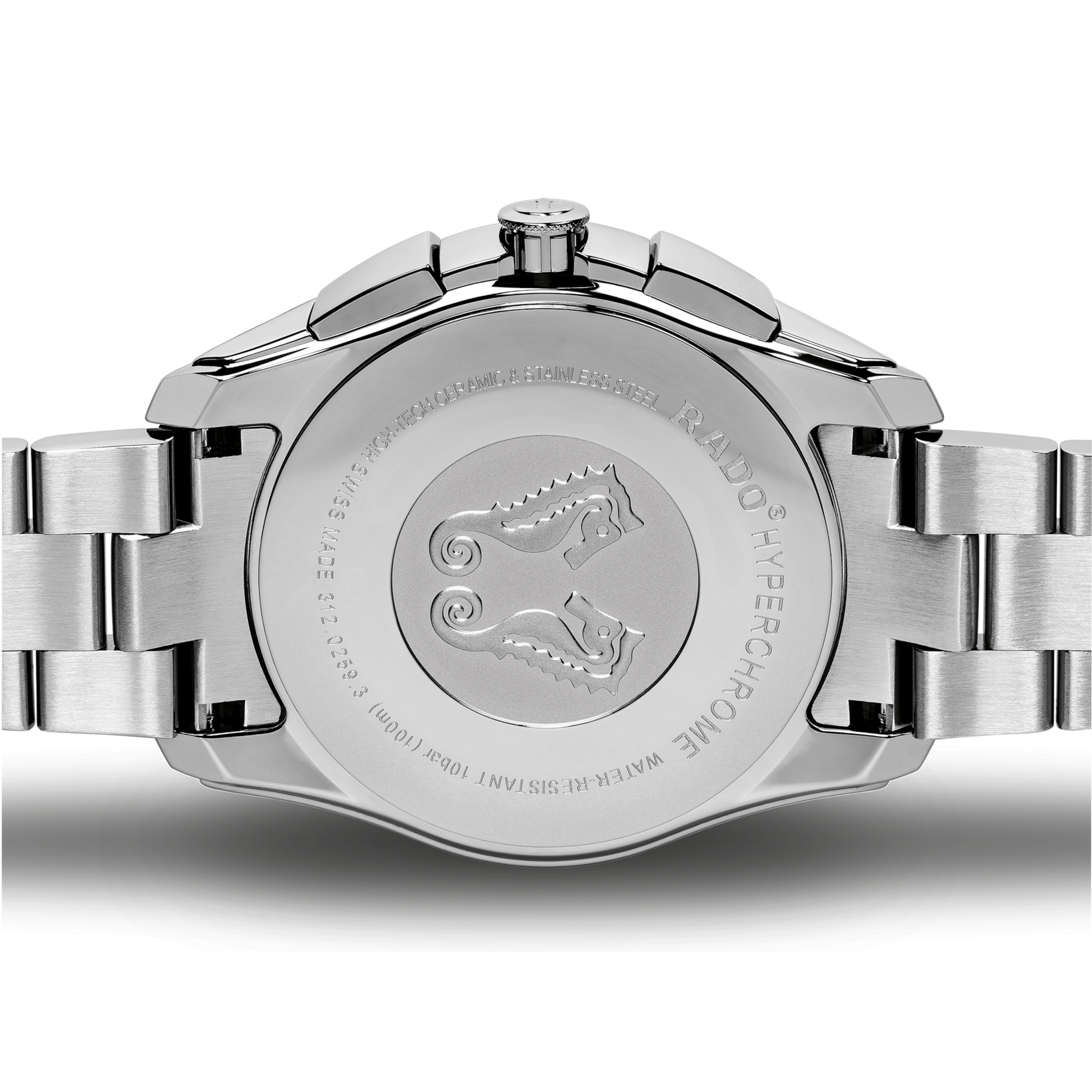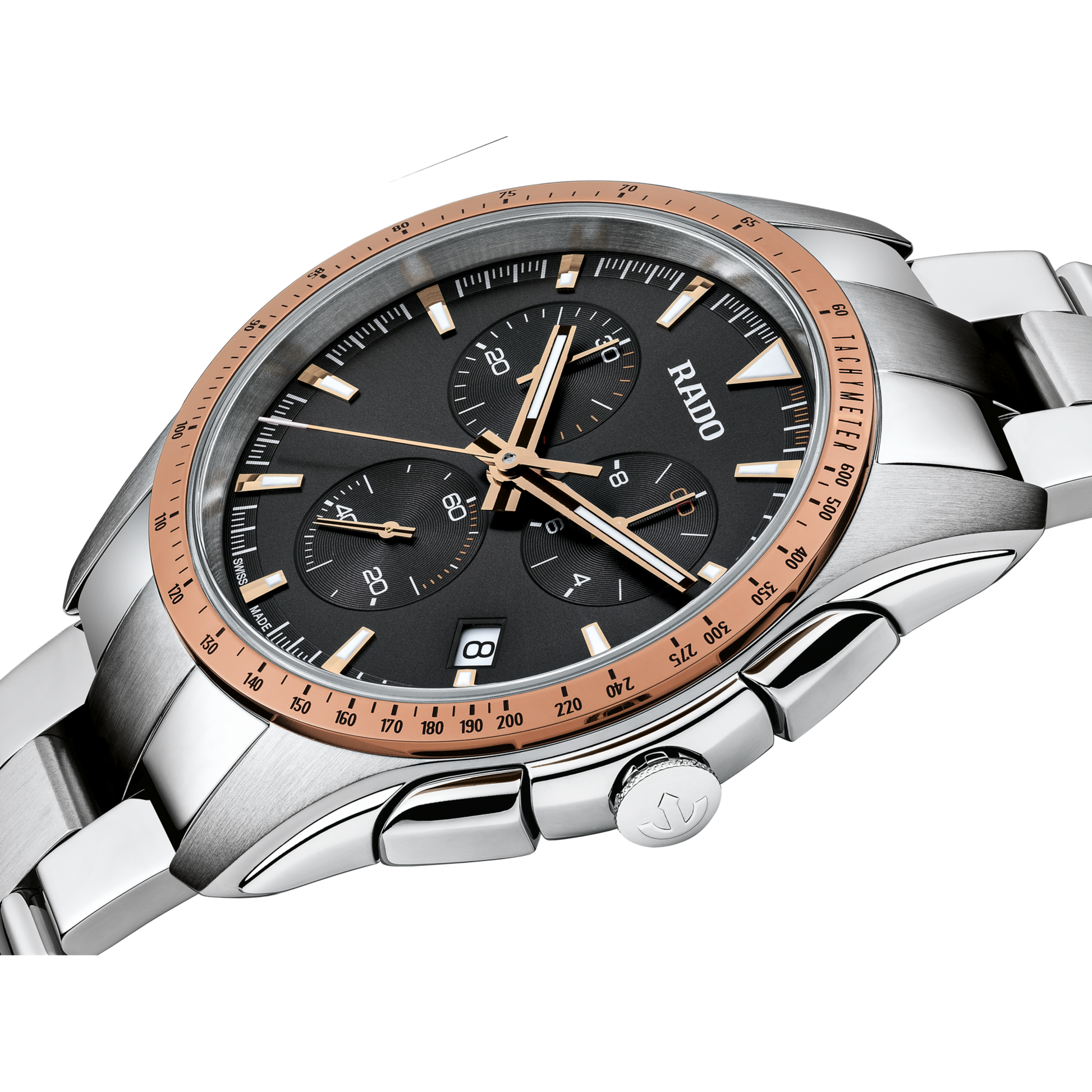 Stainless steel case with a stainless steel bracelet. Fixed stainless steel bezel with a rose gold (high-tech) ceramos top ring showing tachymeter markings. Grey dial with luminous rose gold-tone hands and index hour markers. Minute markers around the outer rim. Dial Type: Analog. Luminescent hands and markers. Date display at the 4 o'clock position. Chronograph - three sub-dials displaying: 60 second, 30 minute and 1/10th of a second. Rado calibre 312 quartz movement. Scratch resistant sapphire crystal. Pull / push crown. Solid case back. Round case shape. Case size: 44.9 mm. Case thickness: 11.7 mm. Band width: 21 mm. Fold over clasp with a push button release. Water resistant at 50 meters / 165 feet. Functions: chronograph, tachymeter, date, hour, minute, small second. Sport watch style. Watch label: Swiss Made. Rado HyperChrome Chronograph Grey Dial Mens Watch R32259163.