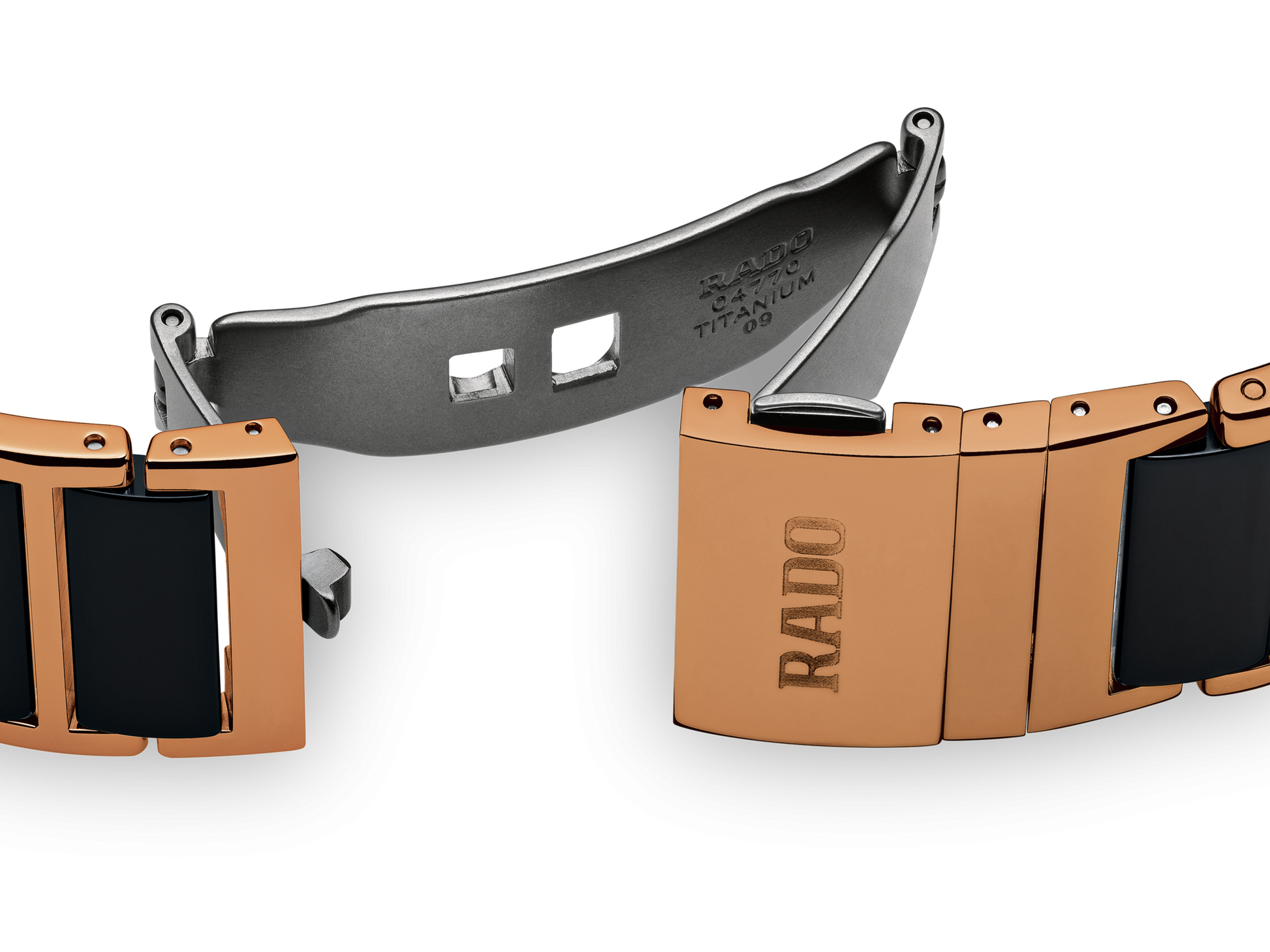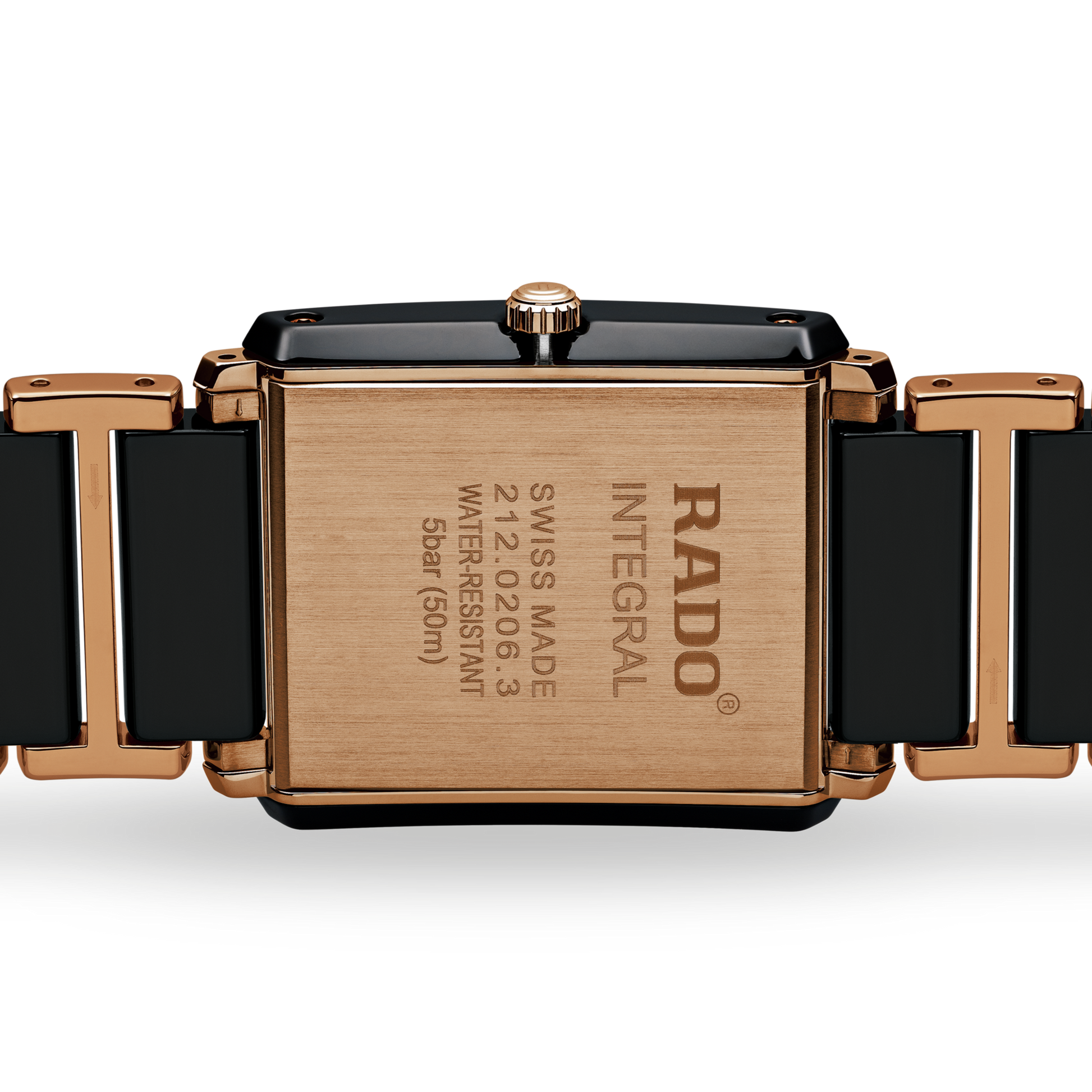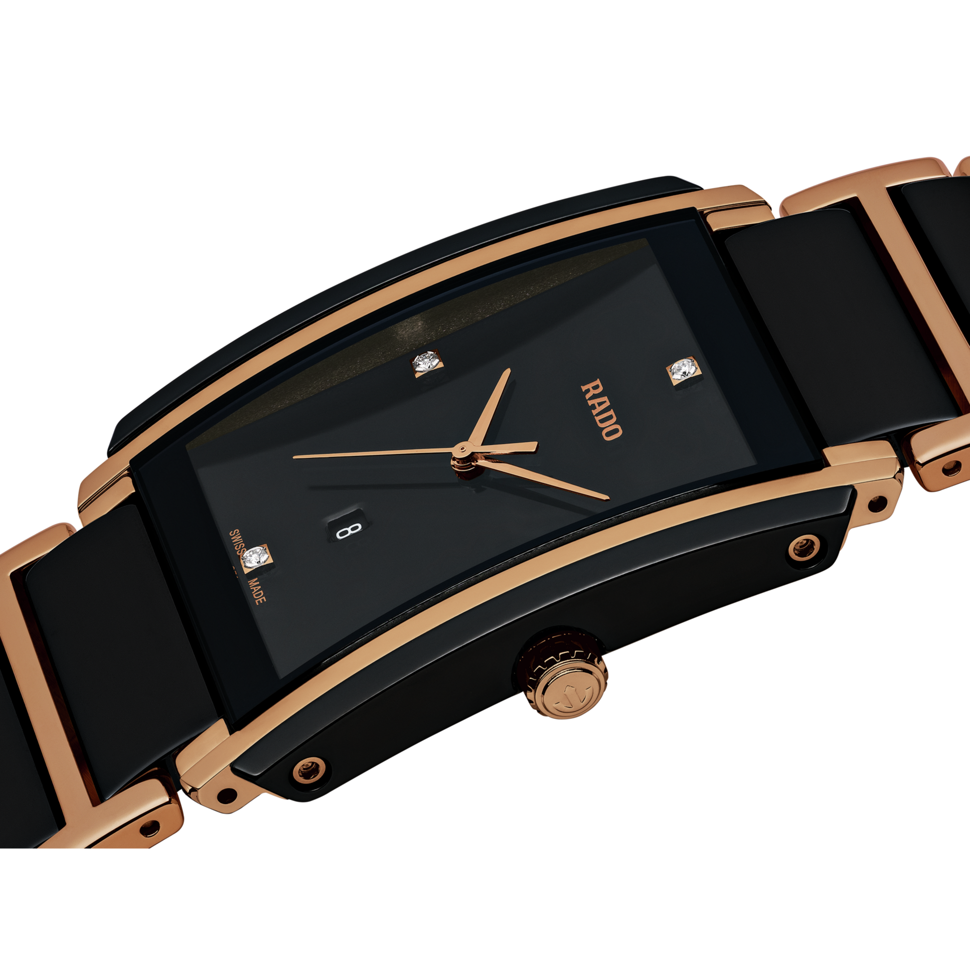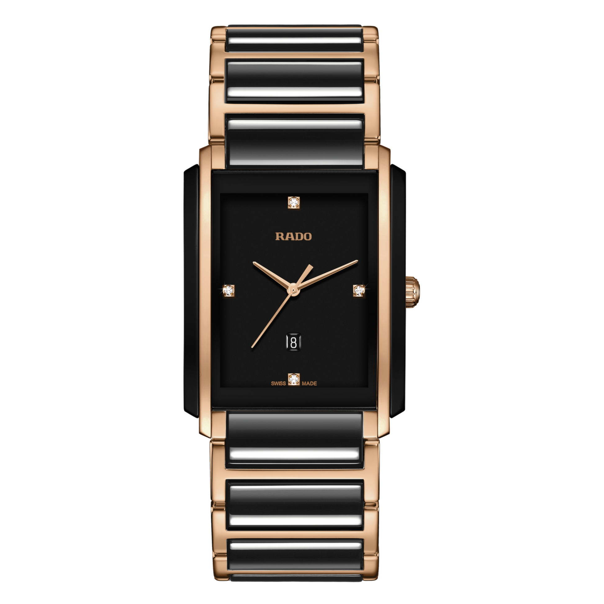 Black high-tech ceramic case with a black high-tech ceramic bracelet with rose gold PVD traim. Fixed black ceramic bezel with rose gold PVD accents. Black dial with rose gold-tone hands. Diamonds set at the 3, 6, 9 and 12 o'clock positions. Dial Type: Analog. Date display above the 6 o'clock position. ETA caliber E61.111 quartz movement. Scratch resistant sapphire crystal. Pull / push crown. Solid case back. Case size: 31 mm x 41.1 mm, case thickness: 7.5 mm. Rectangle case shape. Band width: 20 mm. Deployment clasp. Water resistant at 50 meters / 165 feet. Functions: date, hour, minute, second. Dress watch style. Watch label: Swiss Made. Rado Integral L Black Dial Ceramic Diamond Mens Watch R20207712.