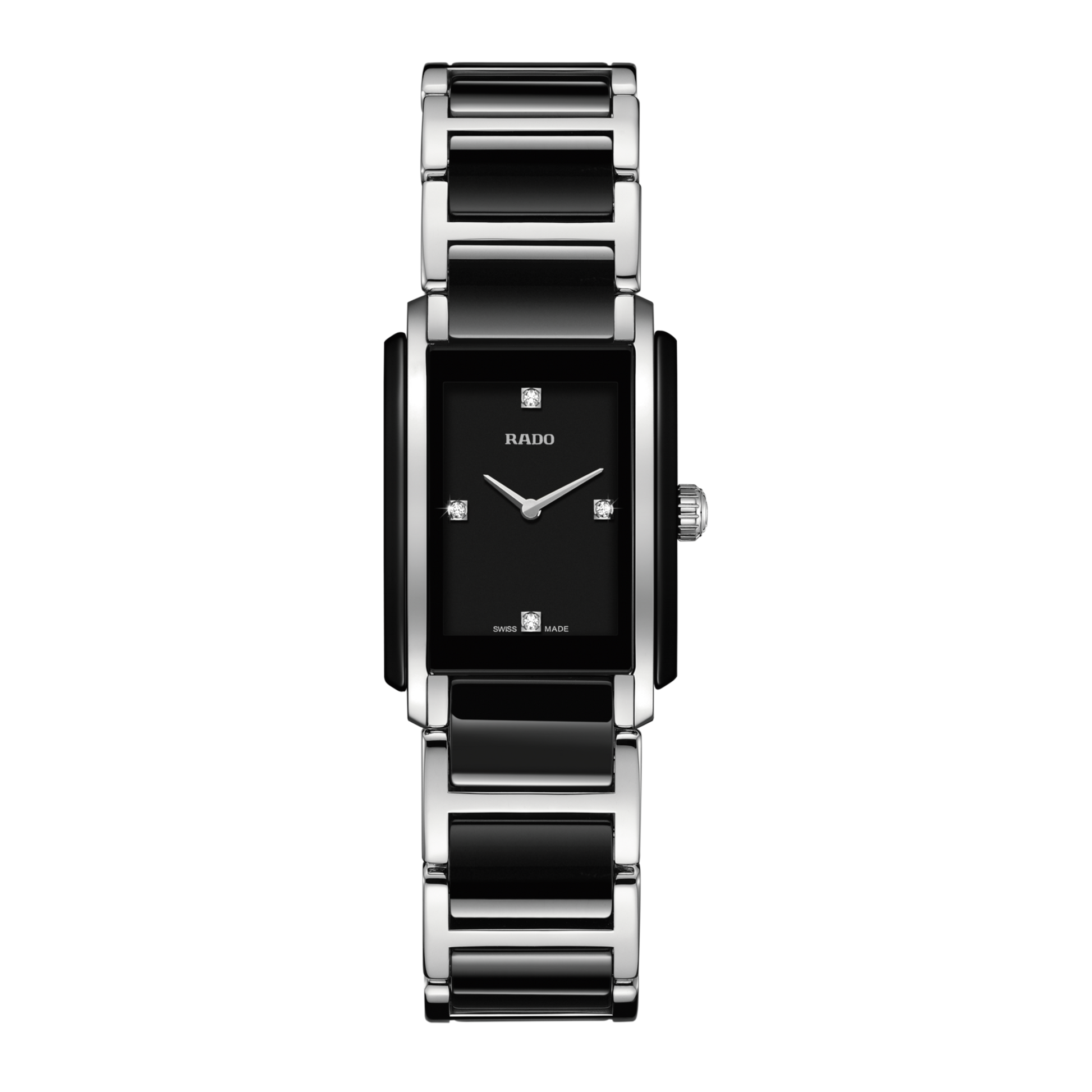 Black ceramic and stainless steel case with a black ceramic and stainless steel bracelet. Fixed bezel. Black dial with silver-tone hands and 4 diamond hour markers. Dial Type: Analog. Quartz movement. Scratch resistant sapphire crystal. Solid case back. Case diameter: 22.7 mm. Rectangle case shape. Deployment clasp. Water resistant at 50 meters / 165 feet. Functions: hour, minute, second. Dress watch style. Rado Integral Quartz Black Dial Black Ceramic And Stainless Steel Ladies Watch R20613712.