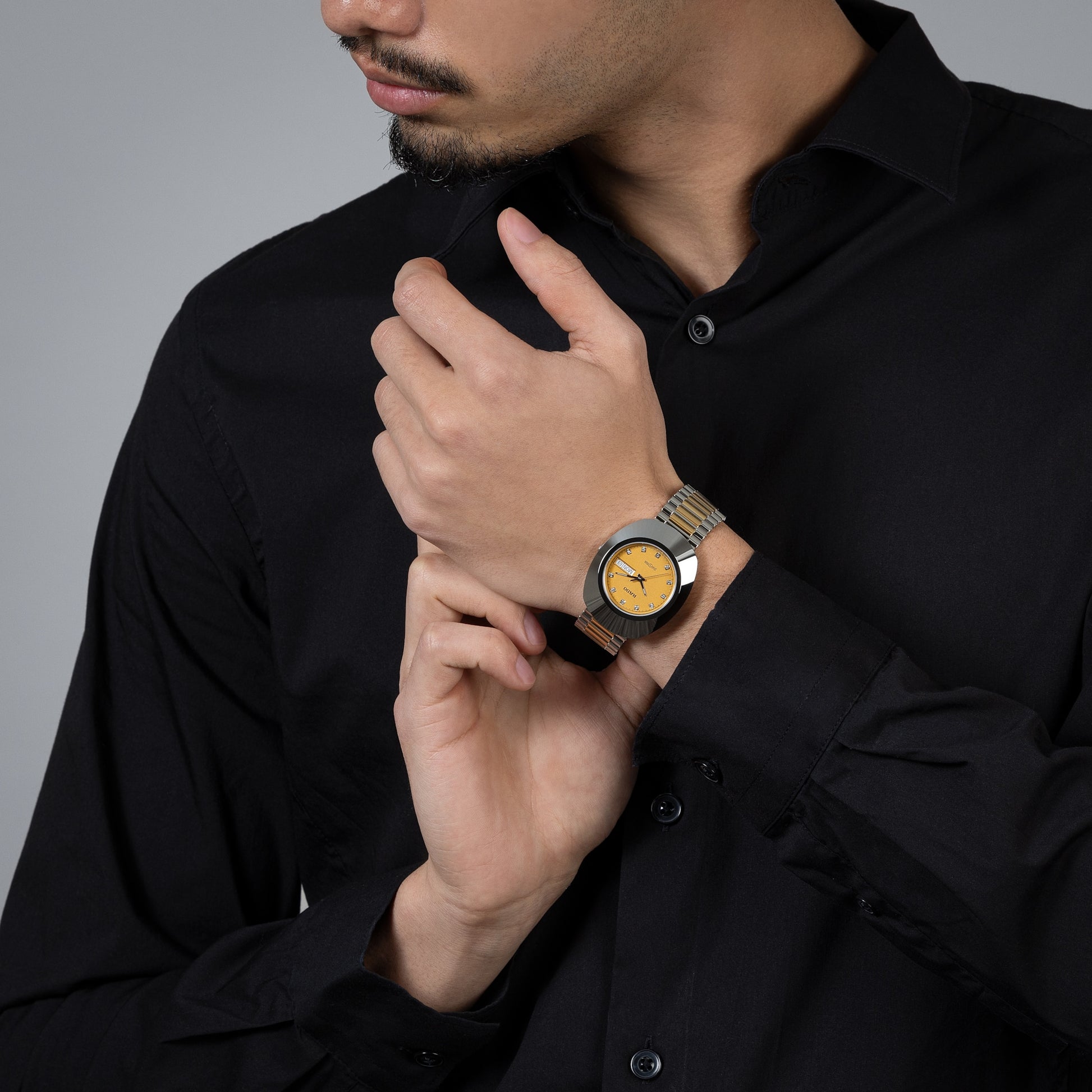 Silver-tone stainless steel case with a two-tone (silver and gold-tone) stainless steel bracelet. Fixed silver-tone stainless steel bezel. Gold dial with silver-tone hands and index hour markers. Minute markers around the outer rim. Dial Type: Analog. Day of the week and date display at the 3 o'clock position. Quartz movement. Scratch resistant sapphire crystal. Screw down crown. Solid case back. Round case shape, case size: 35 mm, case thickness: 8.4 mm. Fold over clasp. Water resistant at 30 meters / 100 feet. Functions: date, day, hour, minute, second. Casual watch style. Watch label: Swiss Made. Rado The Original Two Tone Stainless Steel Mens Watch R12391633.