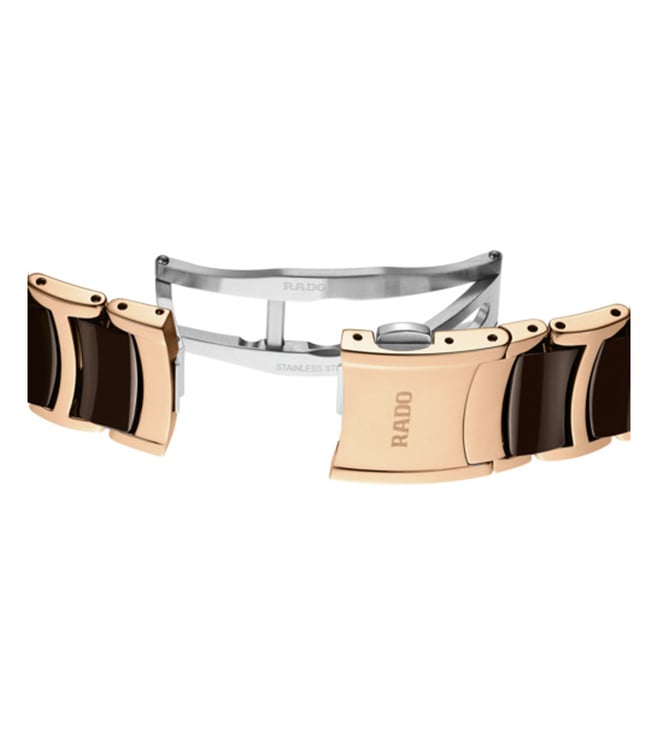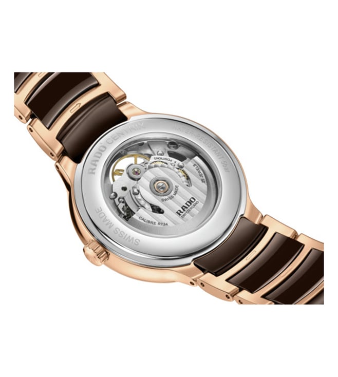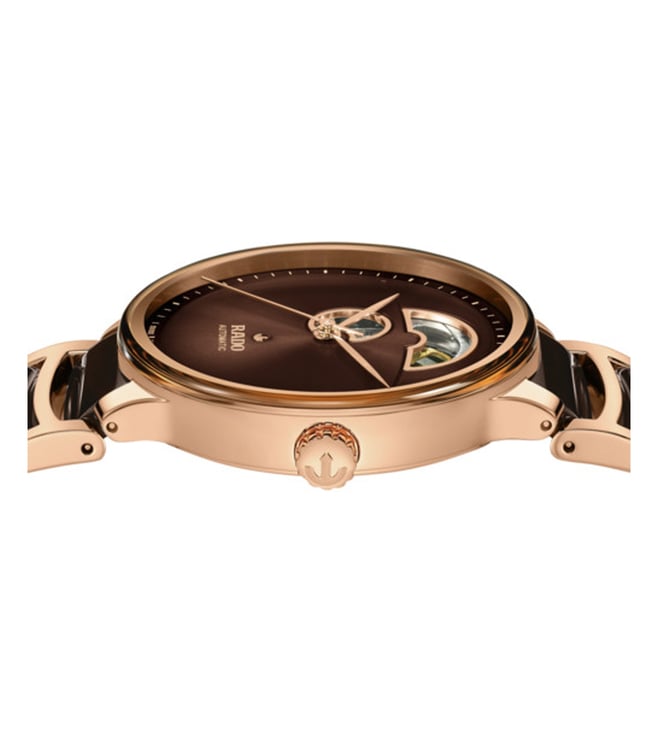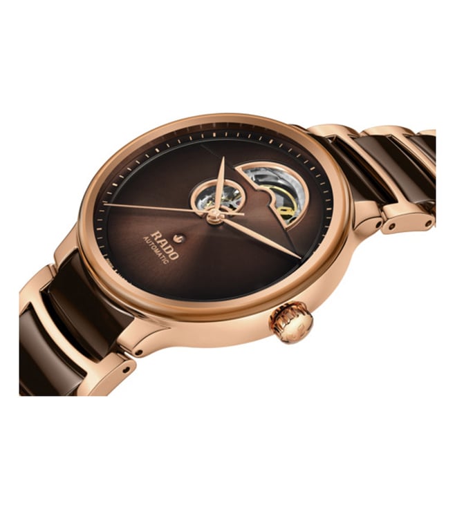 Discover the perfect harmony of innovation and aesthetics with the Rado Centrix Automatic Open Heart. At the heart of this masterpiece beats the Automatic Rado calibre R734 movement, producing impeccable precision and reliability. With an impressive 80-hour power reserve, this watch ensures uninterrupted performance. The antimagnetic Nivachron hairspring and adjustment in five positions further enhance its accuracy. Encased in a polished rose gold coloured stainless steel case, measuring a refined 39.5 mm, the Centrix Automatic Open Heart showcases meticulous craftsmanship.