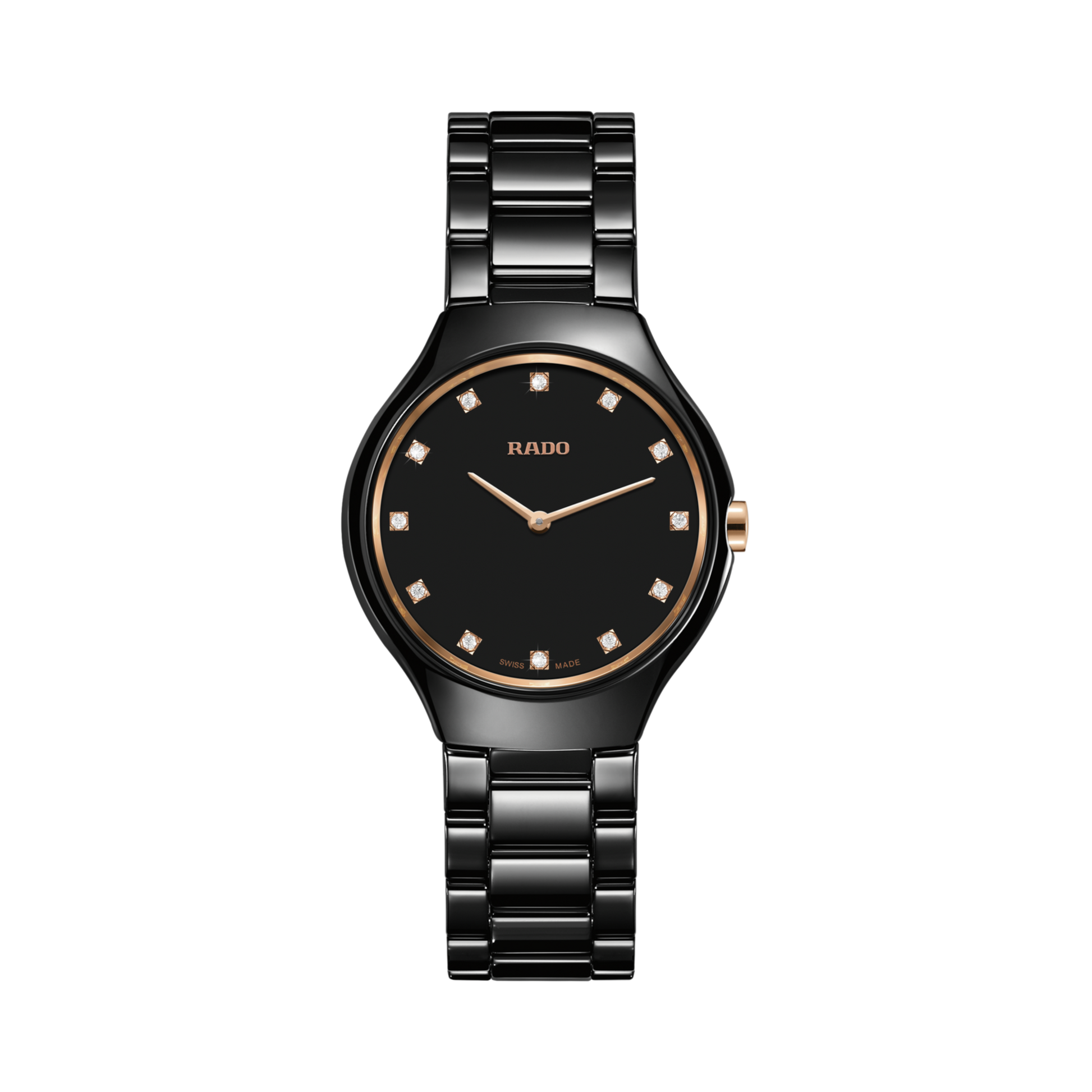 High-tech ceramic, stainless steel case with a black high-tech ceramic bracelet. Fixed black high-tech ceramic bezel. Black dial with rose gold-tone hands and diamonds hour markers. Dial Type: Analog. Rado Calibre 420 quartz movement. Scratch resistant sapphire crystal. Pull / push crown. Solid case back. Round case shape, case size: 30 mm, case thickness: 4.9 mm. Butterfly clasp. Water resistant at 30 meters / 100 feet. Functions: hour, minute. Dress watch style. Watch label: Swiss Made. Rado True Thinline Black Diamond Dial Ladies Watch R27742722.