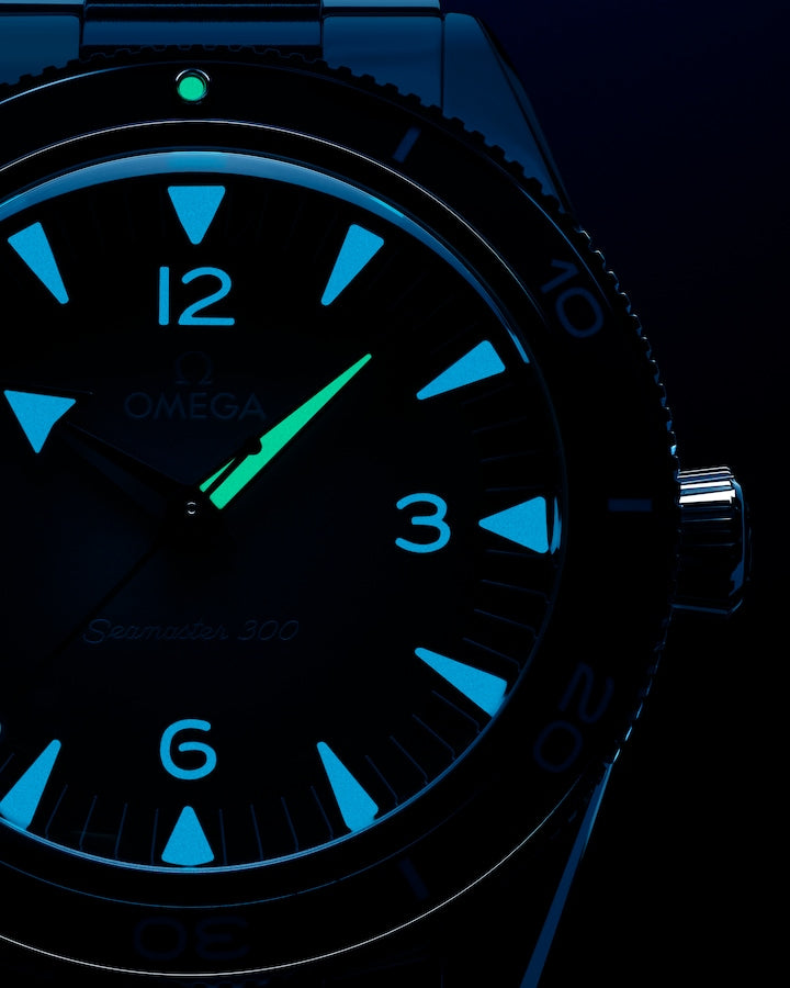 The varnished dial, in OMEGA’s own Summer Blue, has a gradient finish to reflect the watch’s level of water resistance. In keeping with the colour code, OMEGA has filled the rhodium-plated hands, recessed hour markers, and open numerals with a unique light blue Super-LumiNova.