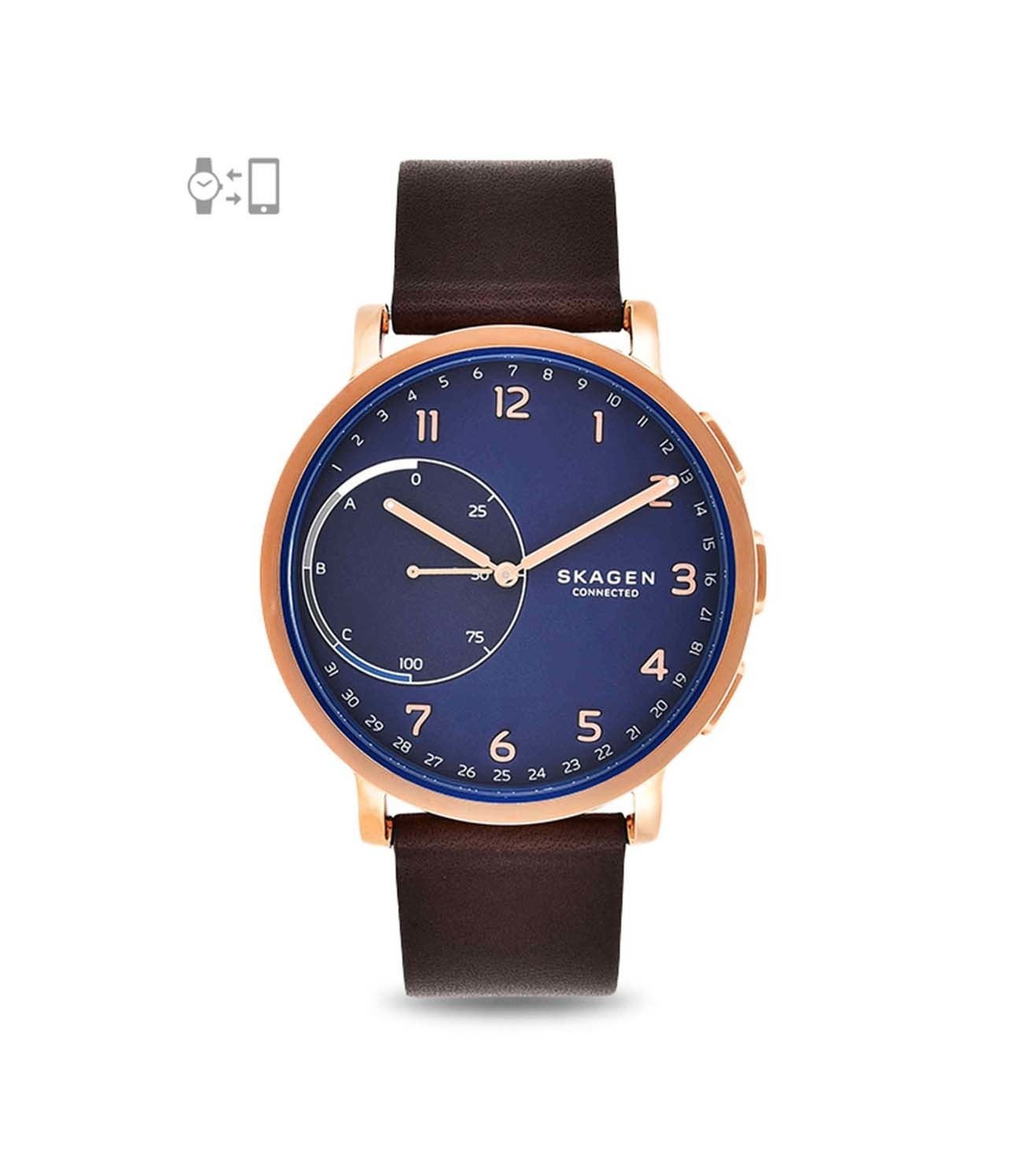 Style arrives effortlessly the moment you wear this men's hybrid smartwatch from the Hagen Connected collection by Skagen. Encased in a 42 mm case, the navy round dial is protected by a mineral glass. Compatible with Android or iPhones, it shows notifications for text, email or calls. It also features sleep tracking, phone finder, music control and many more. The dark brown genuine leather strap can be interchanged with all 20 mm straps to elevate your look. Besides, it is completed with a buckle clasp that can be adjusted according to your need.