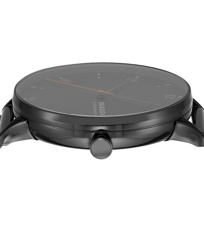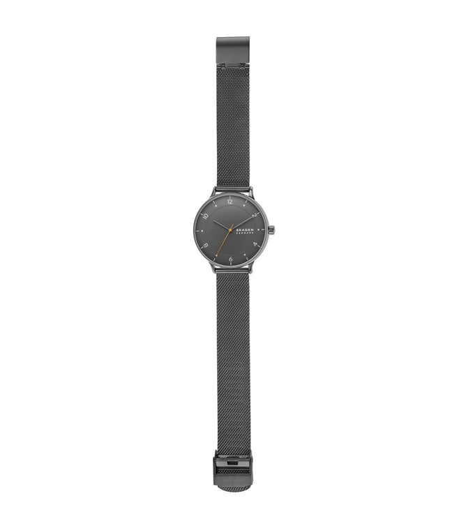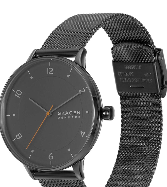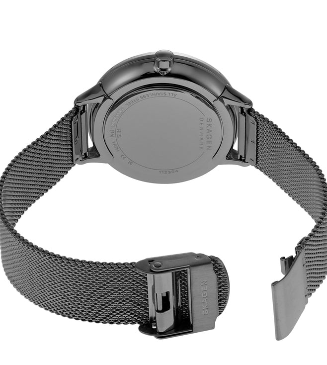 The Skagen's RIIS gunmetal watch, the perfect balance of precision and style. With its sleek 40 mm dial, three-hand movement, and stainless steel mesh bracelet, this timepiece is ideal for everyday wear, complementing your attire.