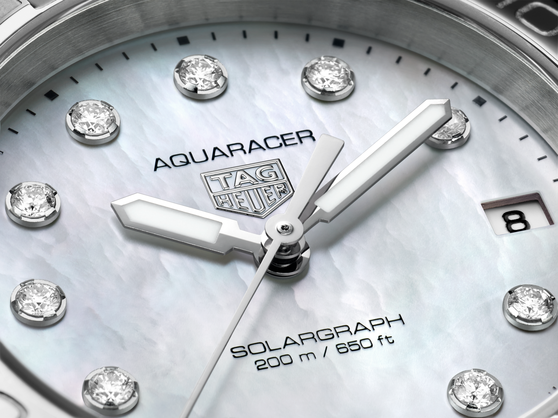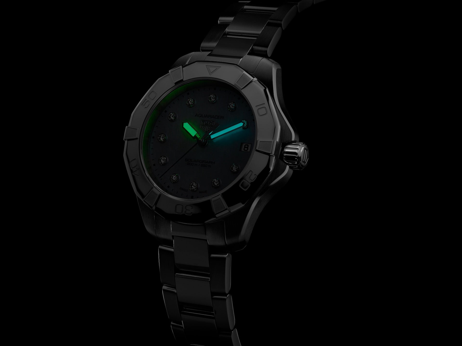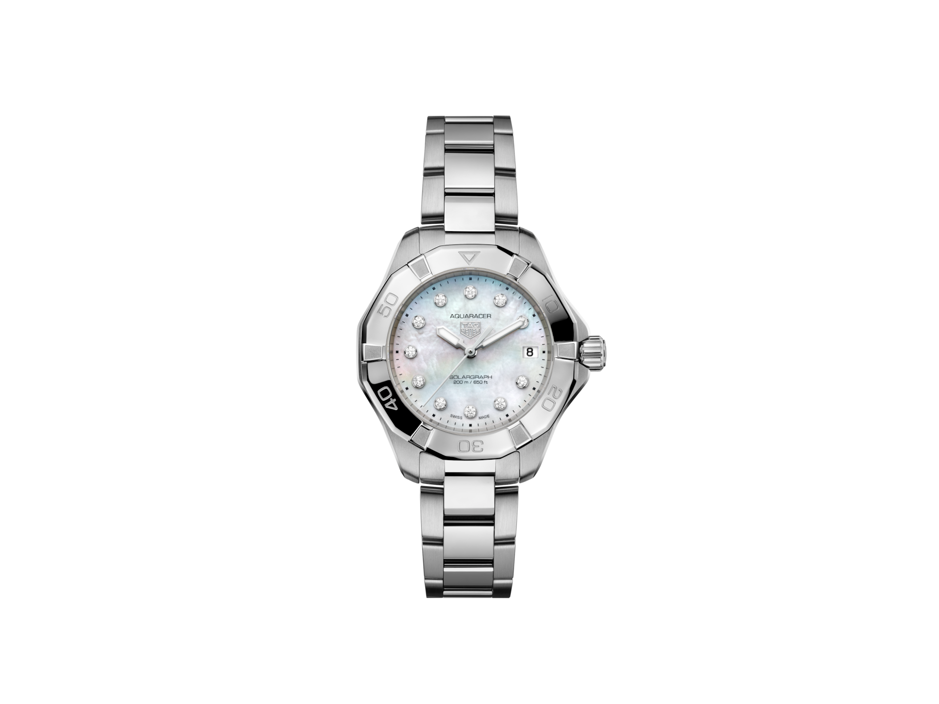 Elevate your elegance with this TAG Heuer Aquaracer, a fusion of precious materials and robust functionality. Designed for the modern adventure-seeker, this 34 mm watch is your luxurious companion for every journey and equipped with our Solargraph movement.