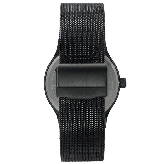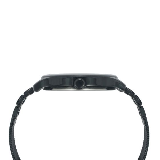 Full black stainless steel mininimal sleek watch with black cambered dial and day date feature comes with hybrid mesh and linked bracelet