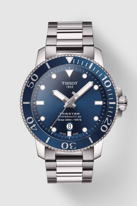Tissot Seastar 1000 Powermatic 80,Stainless Steel,Round,43,Blue,Date, Screw-down crown and case back, See Through Case Back, ,Men,Scratch Resistant Sapphire Crystal,Automatic,Silver,Stainless Steel