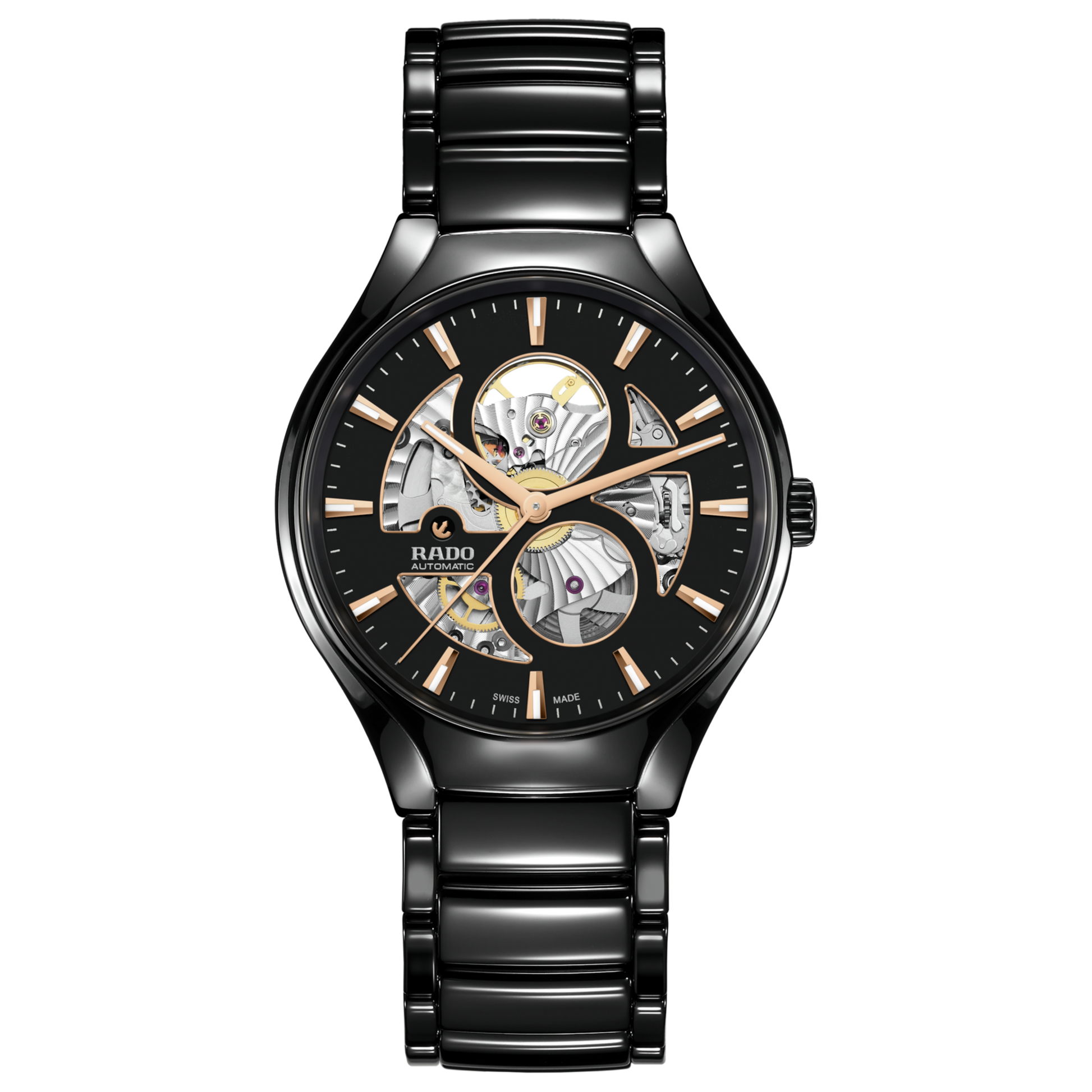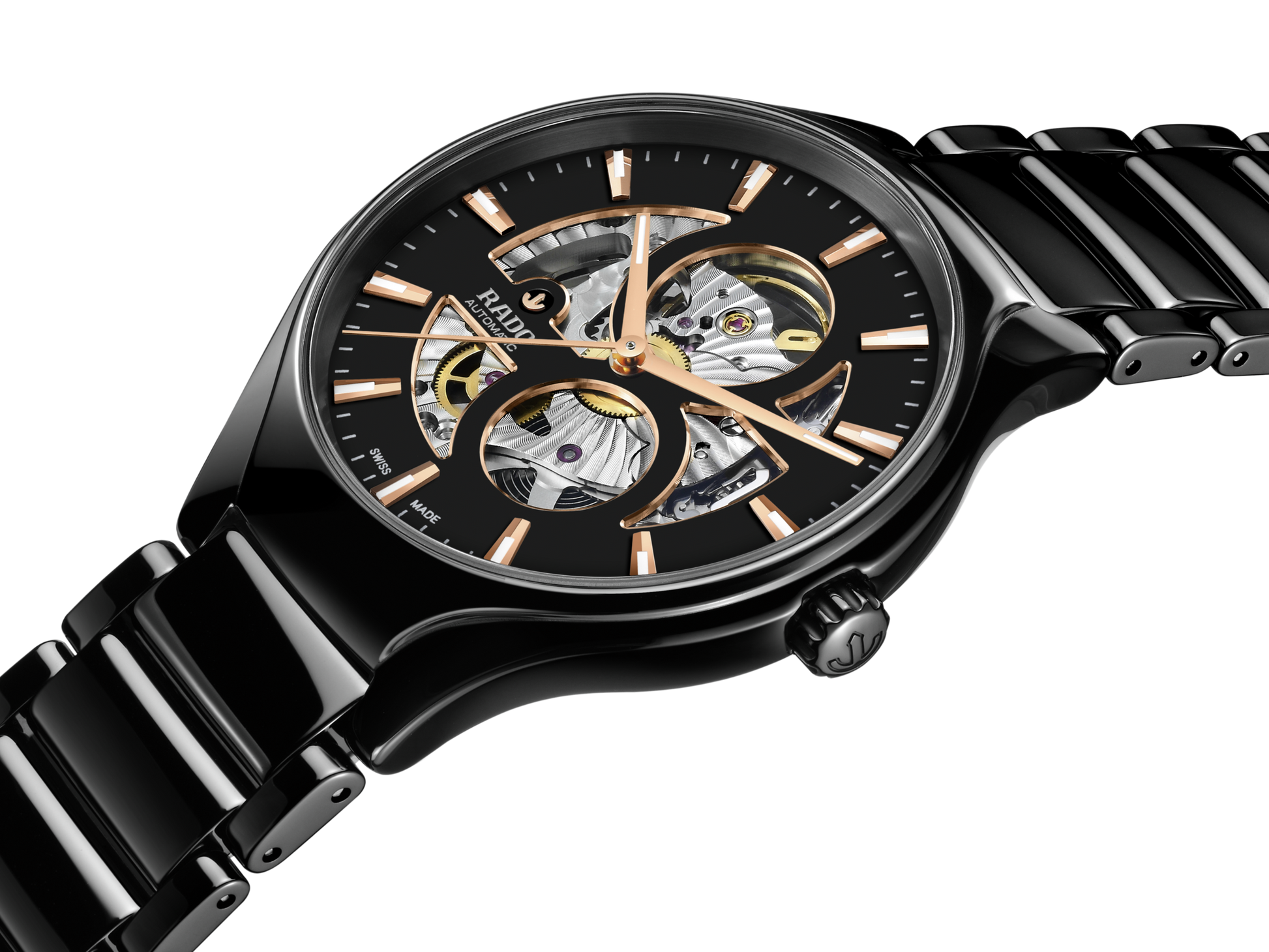 Experience the perfect blend of design excellence and material mastery with the Rado True Round Open Heart. This remarkable timepiece showcases a captivating open heart design, allowing you to admire the intricate movements of the automatic Rado caliber R734, a pure expression of the art of watchmaking. Fitted with an antimagnetic Nivachron™ hairspring, it delivers a power reserve of 80 hours. It has a polished black high-tech ceramic monobloc case and crown and a black PVD-coated titanium case whose sapphire crystal allows an unobstructed view of the movement. It features a black sunray dial with rose gold-colored bevels and a gray printed minute track. Fittingly, this study in black is delivered on a polished black high-tech ceramic bracelet with a titanium 3-fold clasp. The watch is water-resistant down to 50 m. The Rado True Round Open Heart is drawn to watches that are relentlessly contemporary, but which also have a timelessness and style that make them true keepsakes
