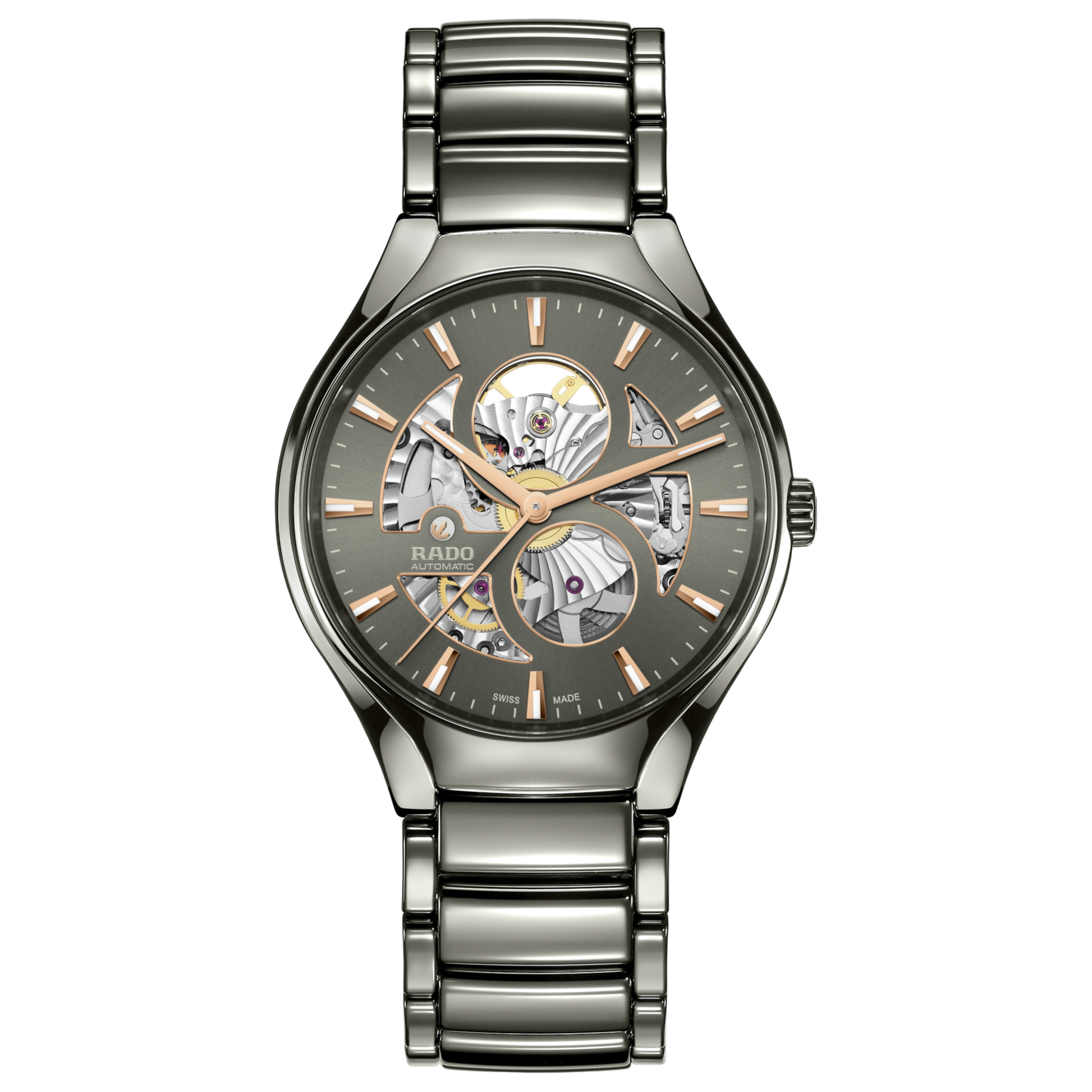 Experience the perfect blend of design excellence and material mastery with the Rado True Round Open Heart. This remarkable timepiece showcases a captivating open heart design, allowing you to admire the intricate movements of the automatic Rado caliber R734, a pure expression of the art of watchmaking. Fitted with an antimagnetic Nivachron™ hairspring, it delivers a power reserve of 80 hours. It has a polished plasma high-tech ceramic monobloc case and crown and a titanium case back whose sapphire crystal reveals an eye-catching view of the movement. It features a gray sunray dial with rose gold-colored bevels and a gray printed minute track. Fittingly, this study in gray is delivered on a polished plasma high-tech ceramic bracelet with a titanium 3-fold clasp. The watch is water-resistant down to 50 m. The Rado True Round Open Heart is drawn to watches that are relentlessly contemporary, but which also have a timelessness and style that make them true keepsakes.