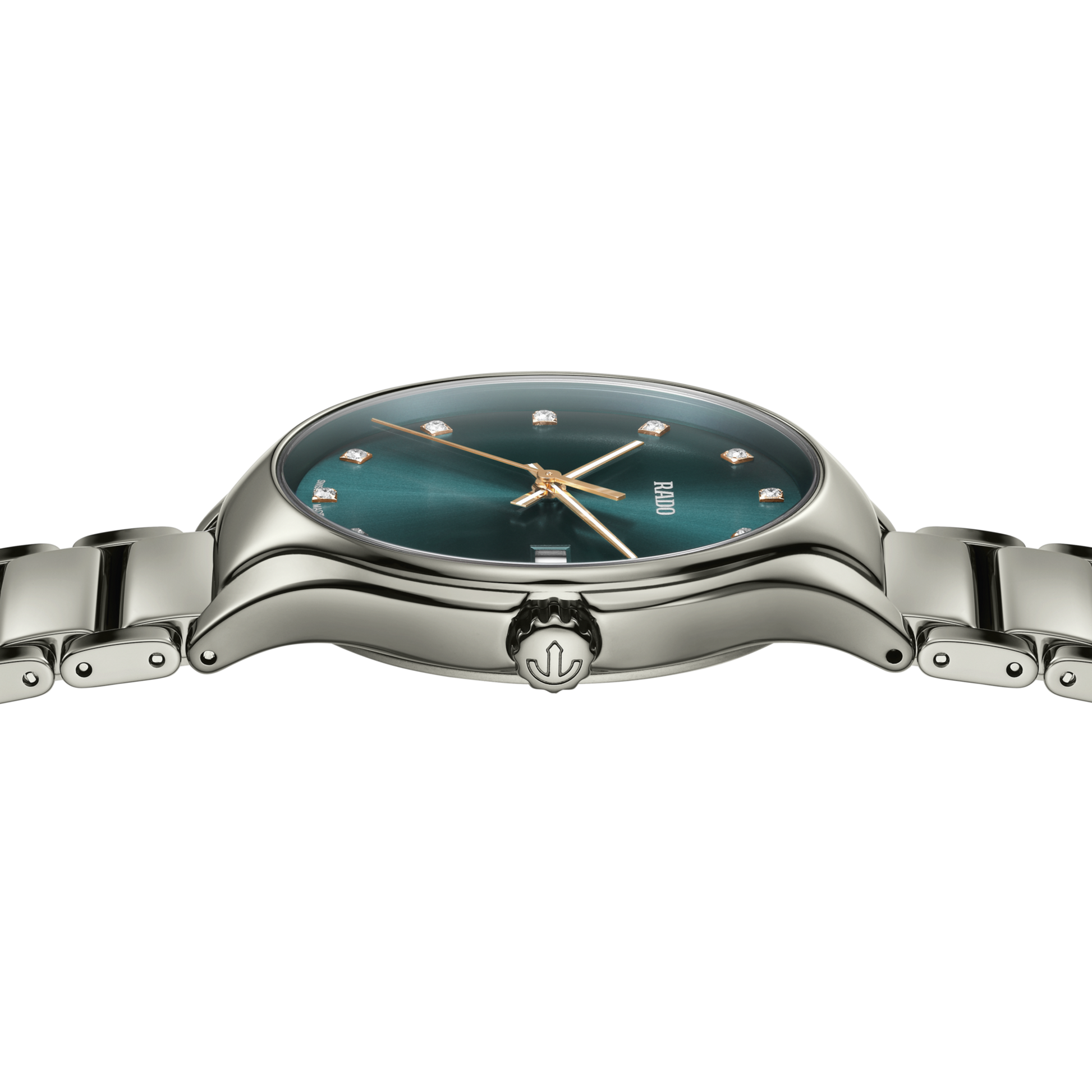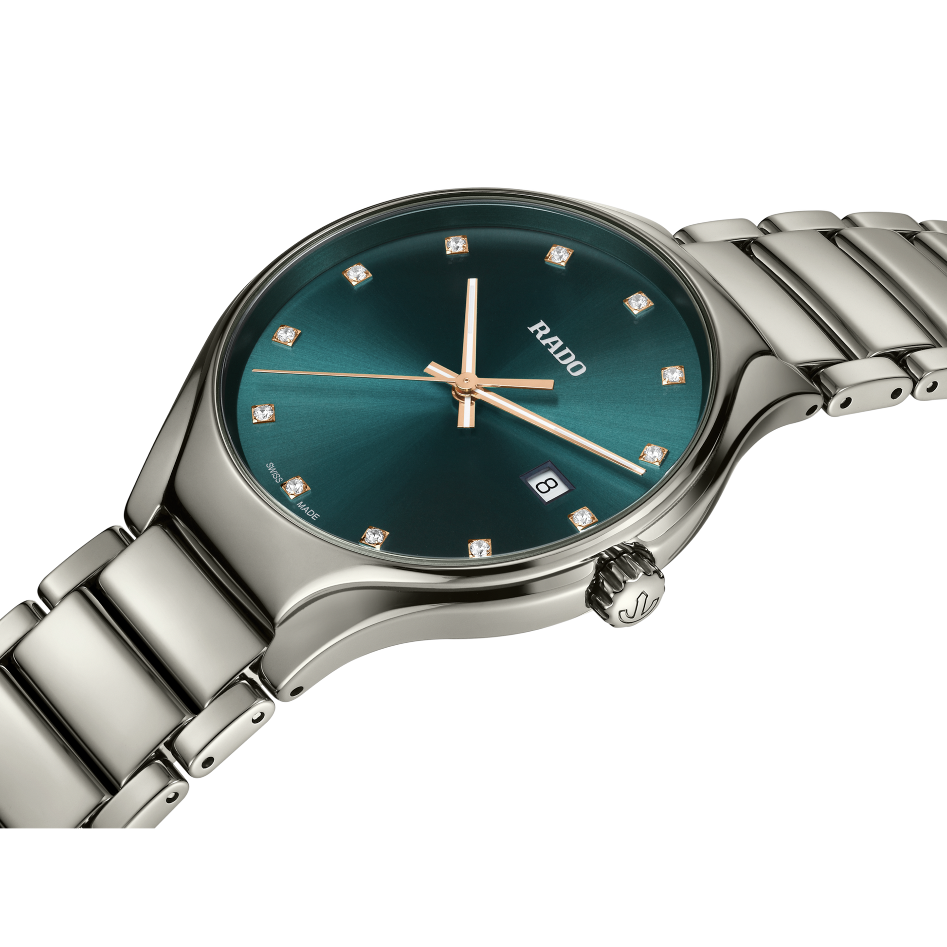 The True Quartz features a 40mm polished plasma high-tech ceramic monobloc case which matches perfectly with the dark turquoise dial. The dial with 12 diamonds is covered by a curved sapphire crystal. The rose gold coloured hands with white veneer are coated with white Super-Luminova® to ensure excellent visibility. The watch is water-resistant up to (50m) and equipped with a polished plasma high-tech ceramic bracelet, fastened by a reliable, triple-fold titanium clasp.