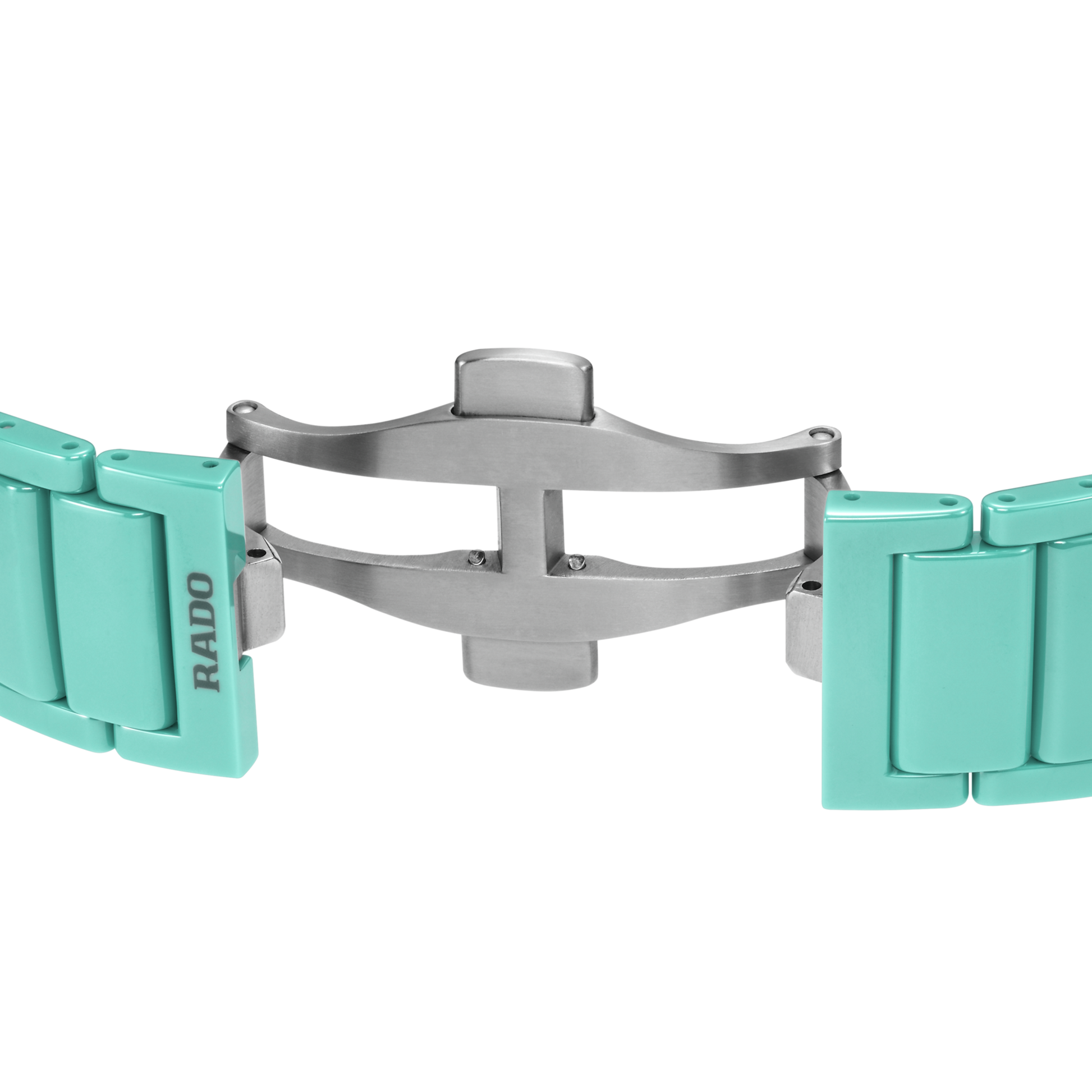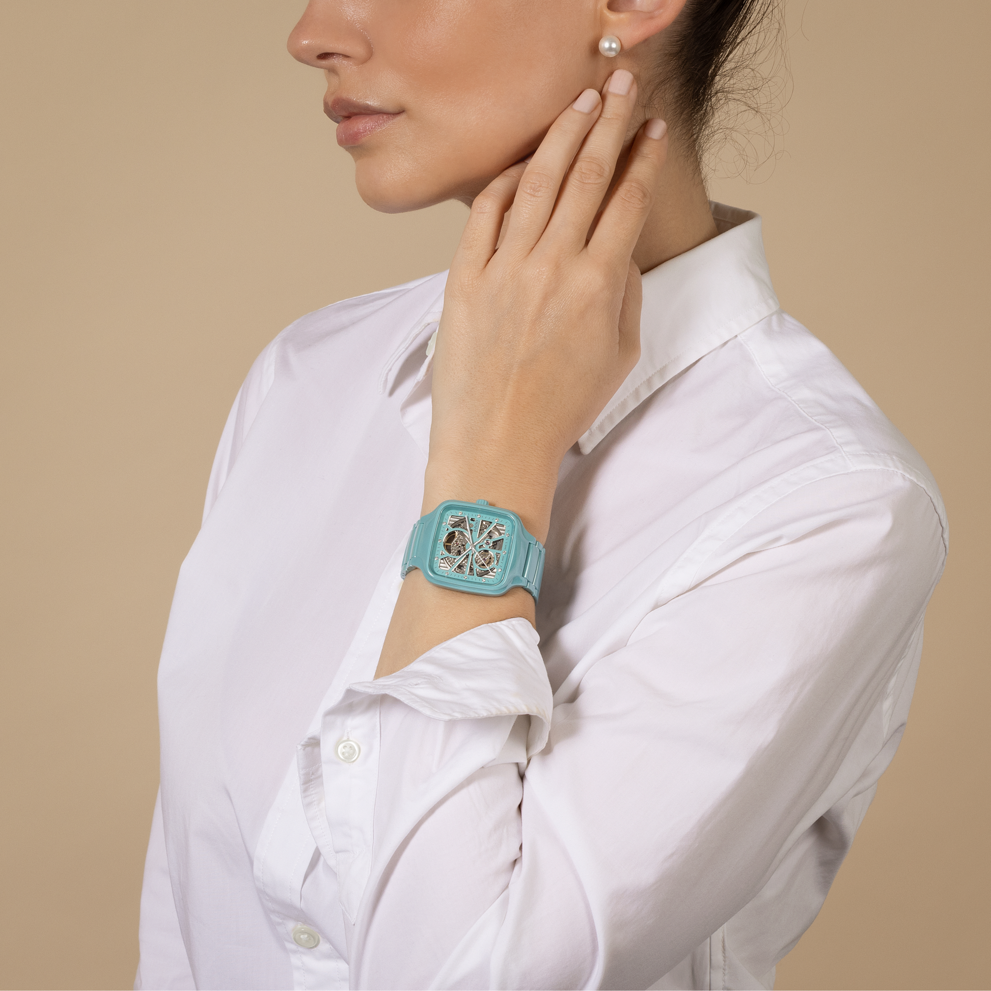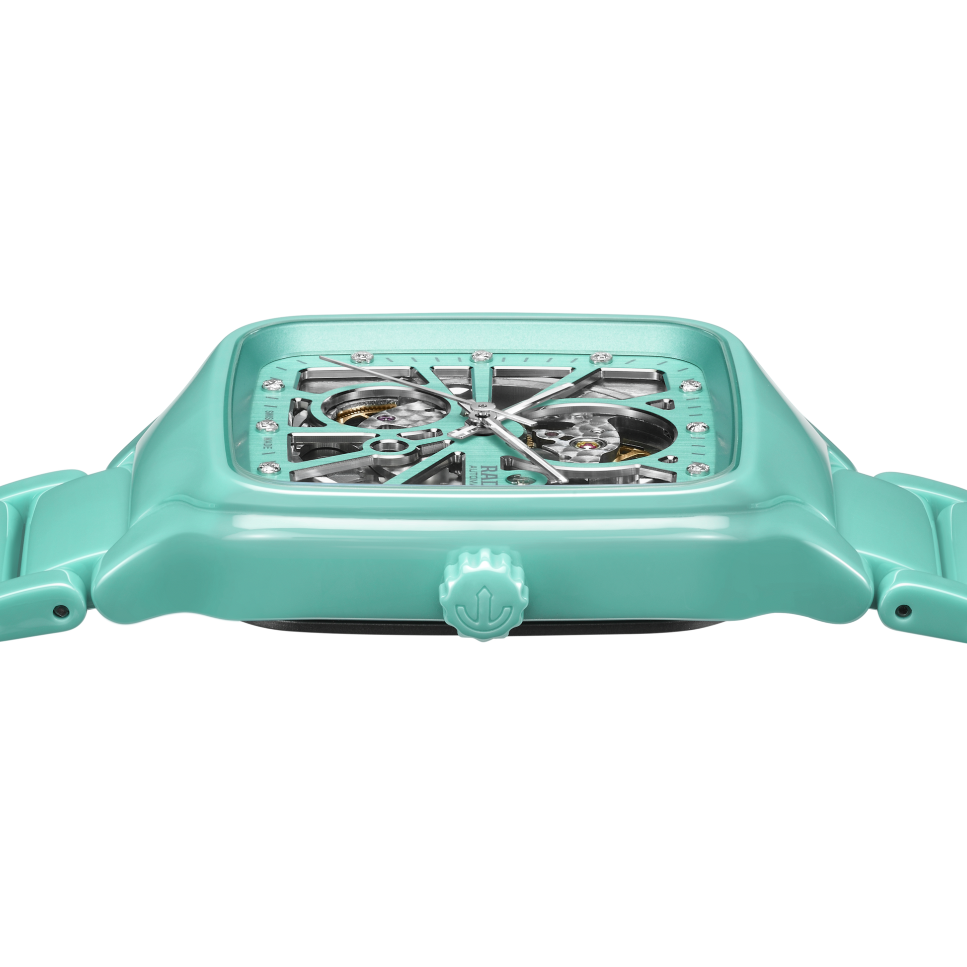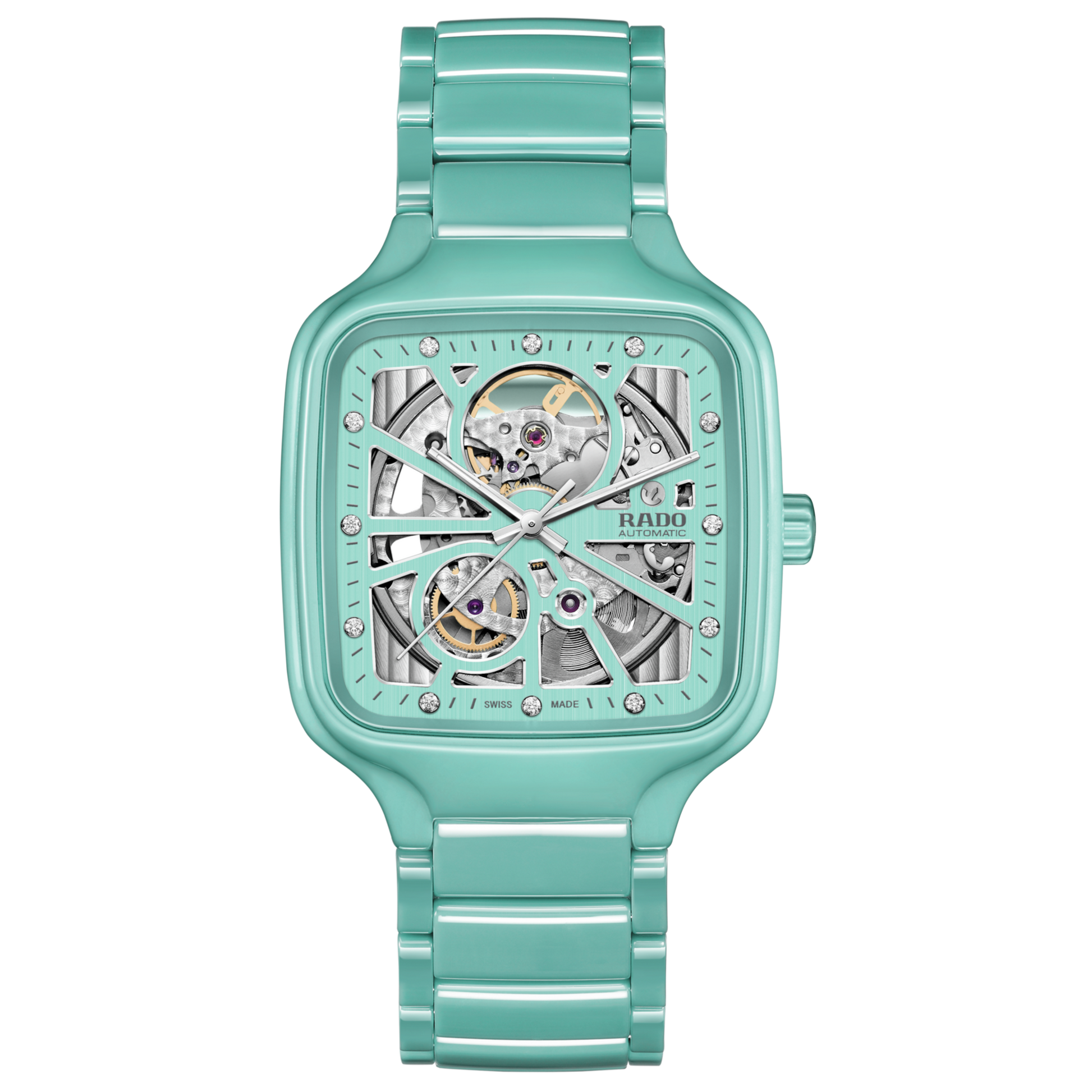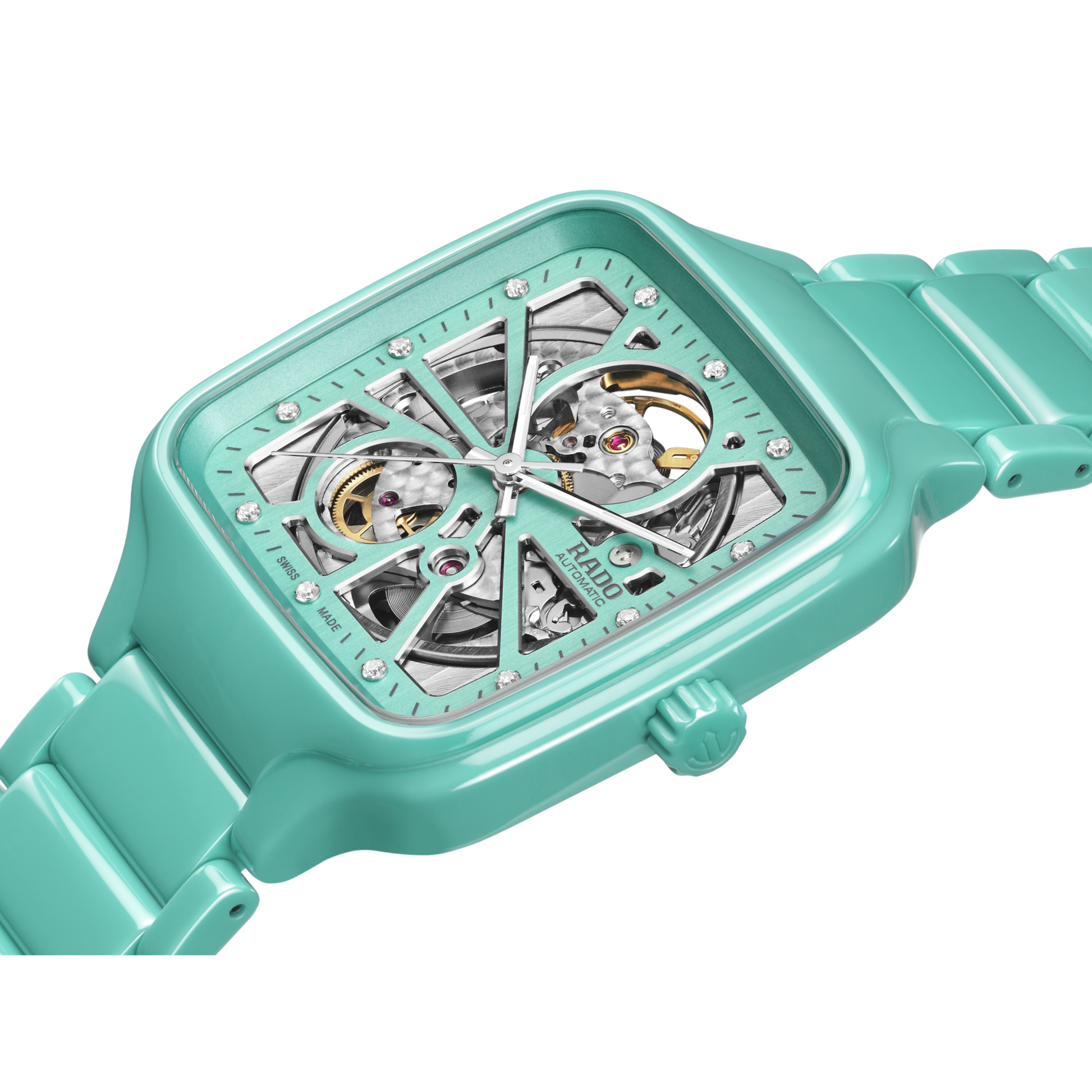 Experience the perfect fusion of artistry and precision with the Rado True Square Automatic Open Heart watch. This remarkable timepiece showcases a captivating open-heart design, allowing you to admire the intricate movements of the automatic Rado calibre R734, with its 80-hour power reserve. With a 38 mm case size, the turquoise high-tech ceramic case and crown exude a sleek and contemporary allure. The flat sapphire crystal, with anti-reflective coating on both sides, offers exceptional clarity. The turquoise dial is accentuated by silver-coloured bevels. Twelve diamonds add a touch of luxury and sophistication. The rhodium-coloured hands, enhanced with white veneer and white Super-LumiNova®, ensure excellent visibility, while adding a subtle touch of elegance. Completing the ensemble is the polished turquoise high-tech ceramic bracelet, offering both comfort and durability.