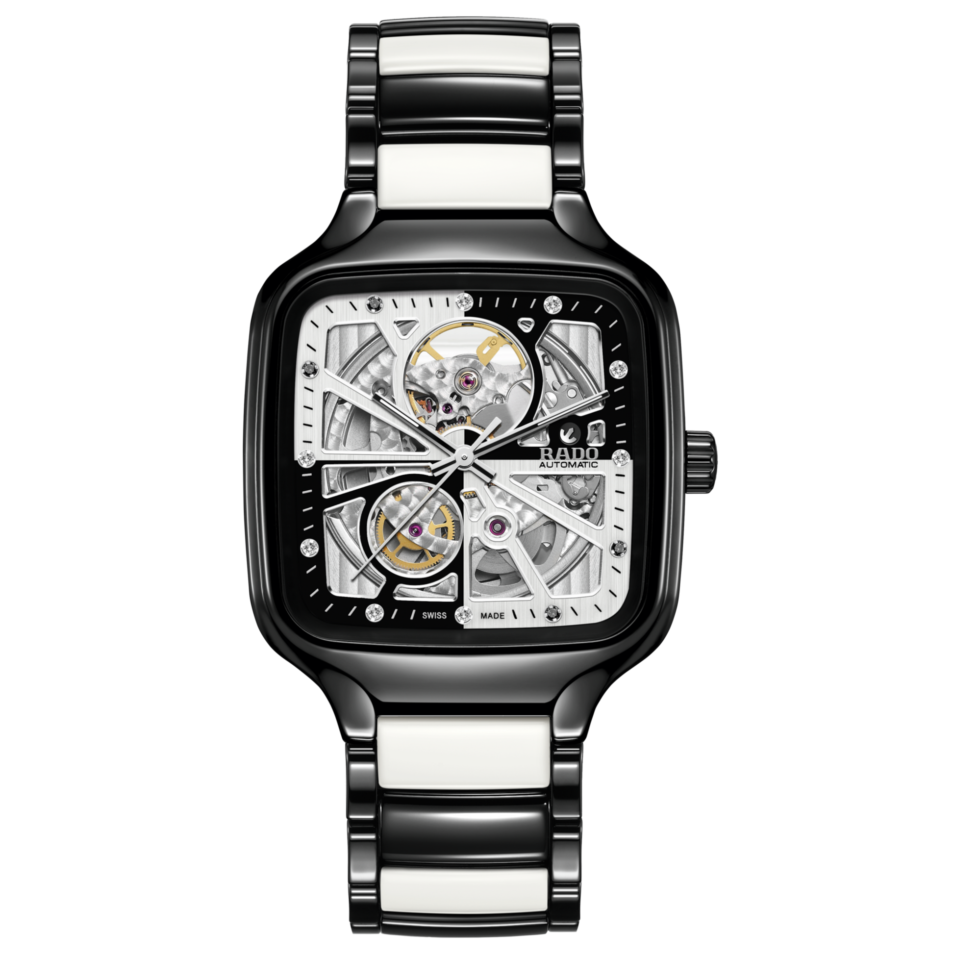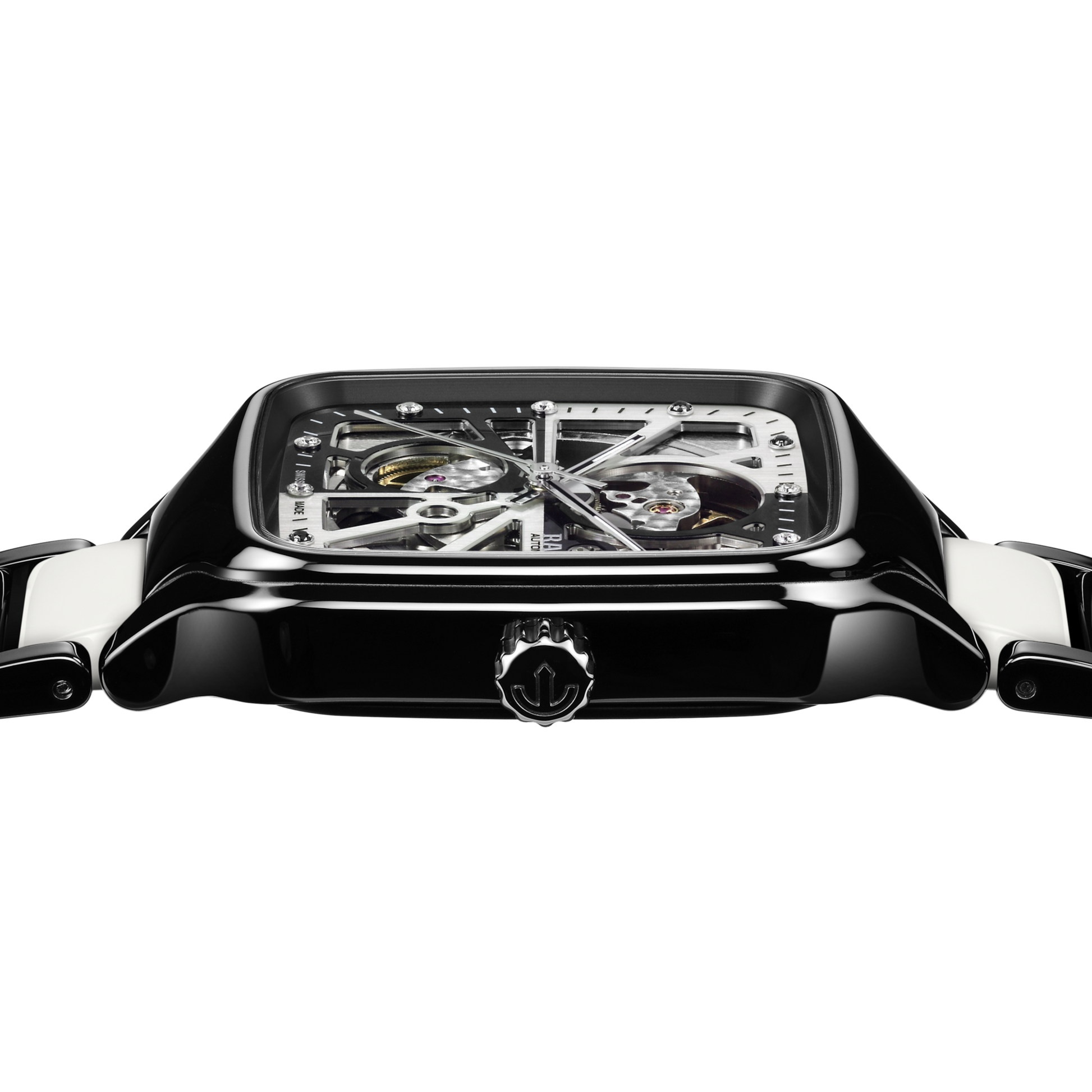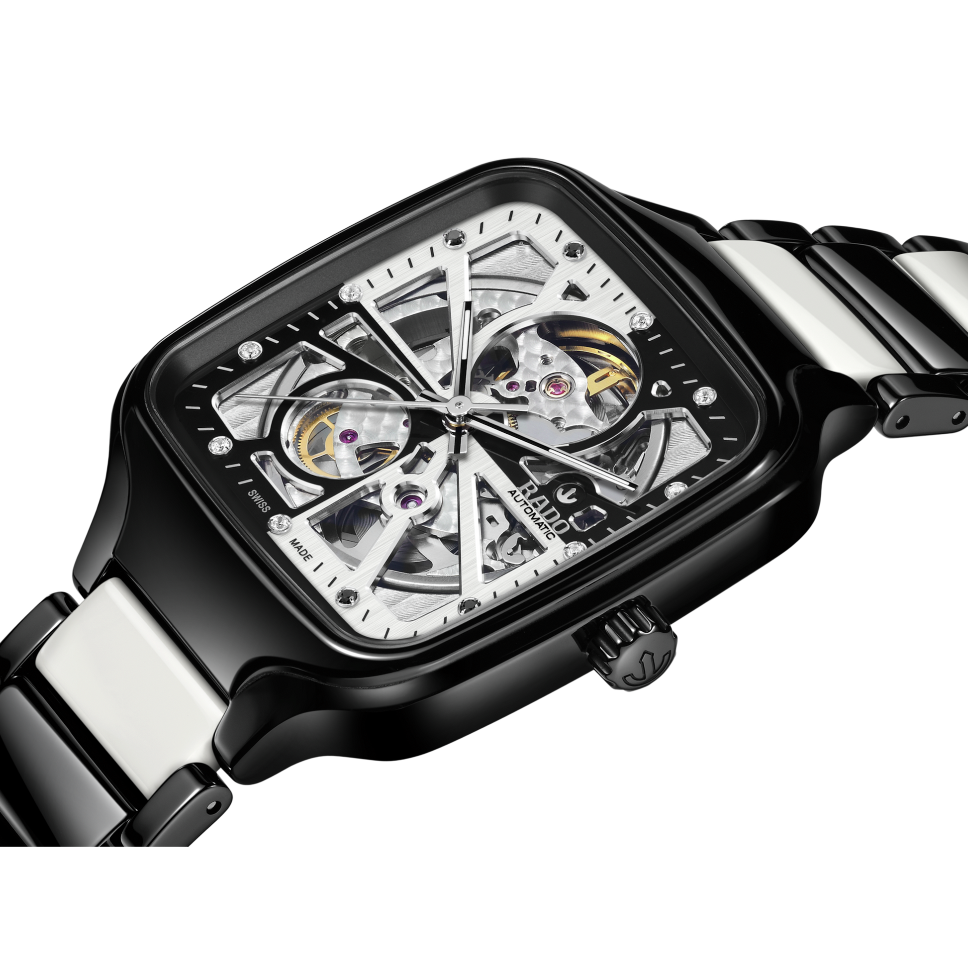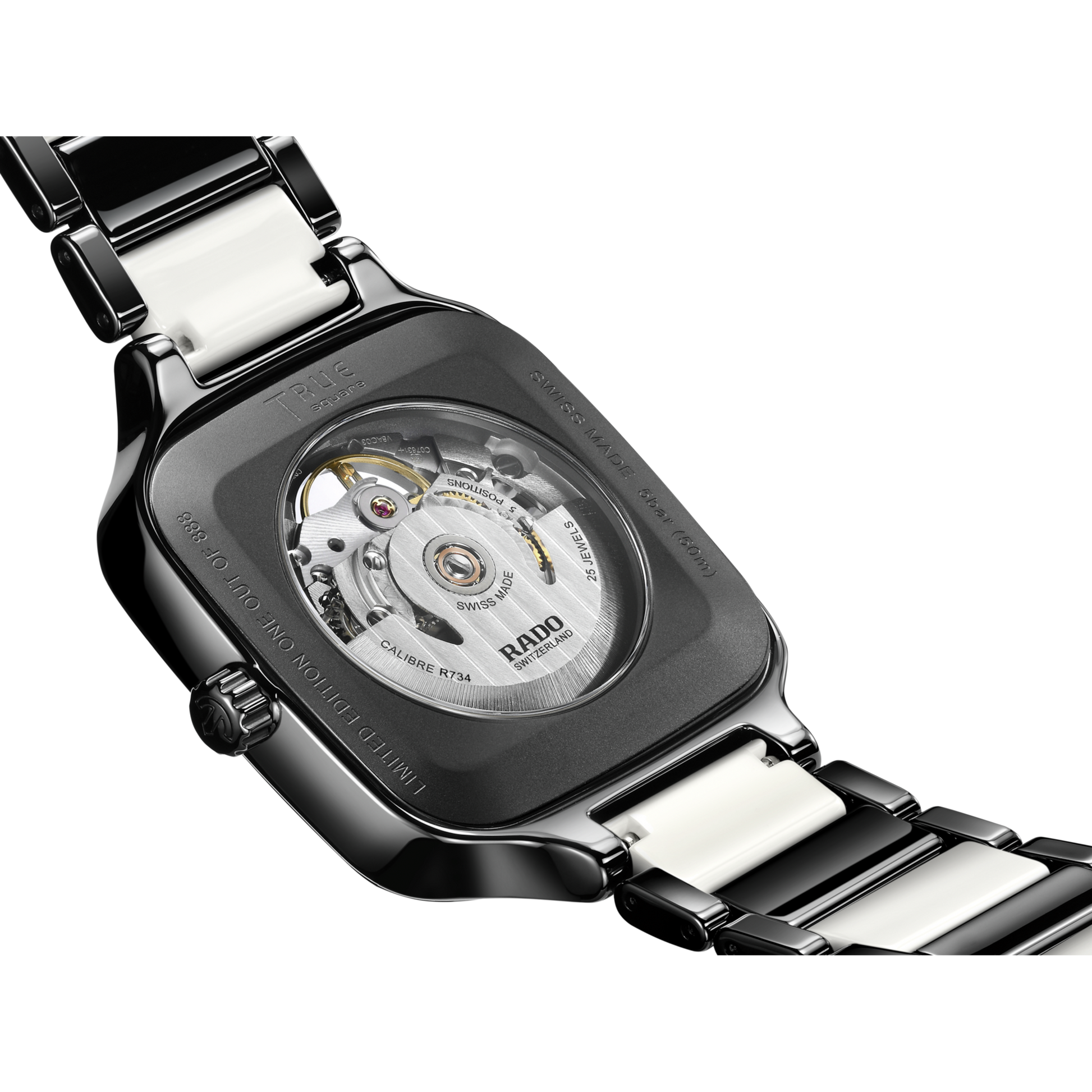 This watch features a black high-tech ceramic monobloc case and crown on a polished black and white high-tech ceramic bracelet. It has a black PVD sandblasted titanium case back engraved with the words LIMITED EDITION ONE OUT OF 888. The sapphire crystal offers a view of the circular grain decorated movement powering the watch. The black and white vertically brushed dial is distinguished with eight Top Wesselton full-cut diamonds and four black diamonds to mark the hours. Also highlighting the Open Heart dial are its rhodium-coloured bevels, a black flange, and Rado’s familiar rhodium-coloured moving anchor symbol against a black background. The presentation is rounded out by the silver printed Rado and black printed Automatic logos. The rhodium-coloured hands have a black veneer and white Super-LumiNova®
